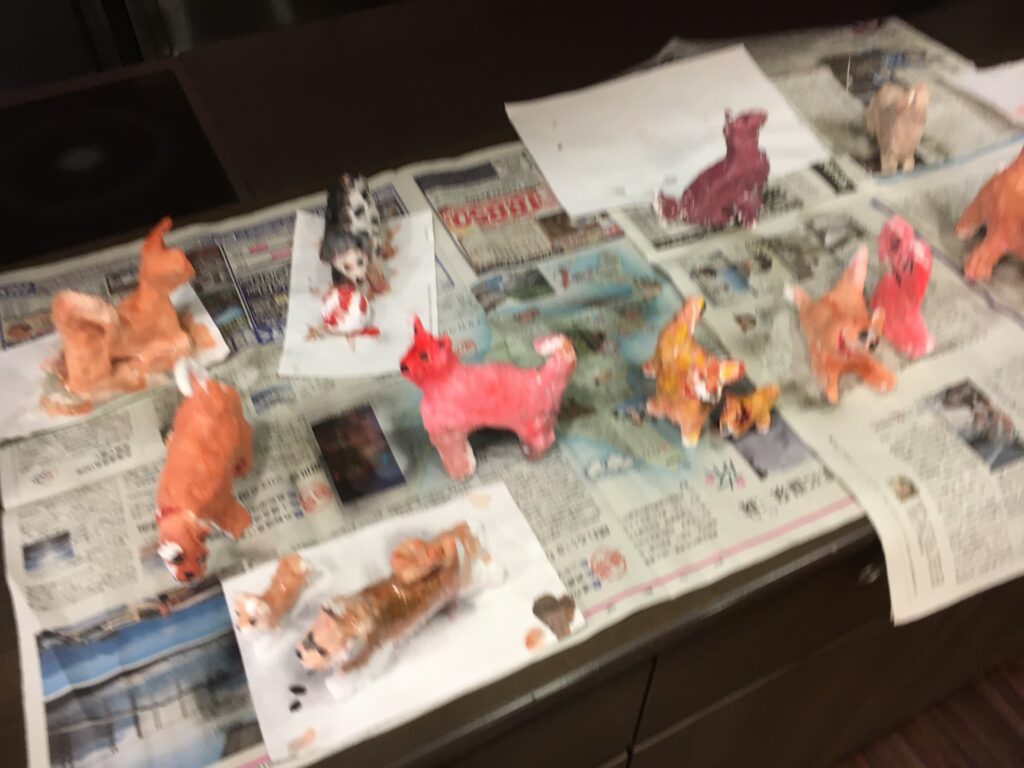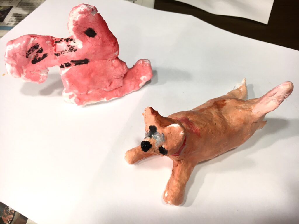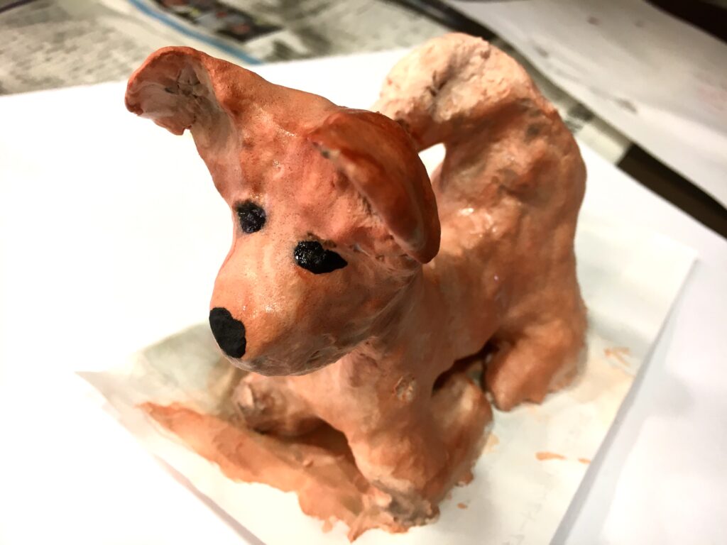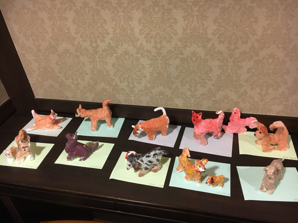 紙粘土で制作しながら、体をつくり、足をつくり、耳をつくる。鼻を伸ばすと、愛犬の顔がきっと目に浮かんでいたことと思う。制作しながら、愛しんでいた愛犬の話をしてくださる方も多くいらしたから。