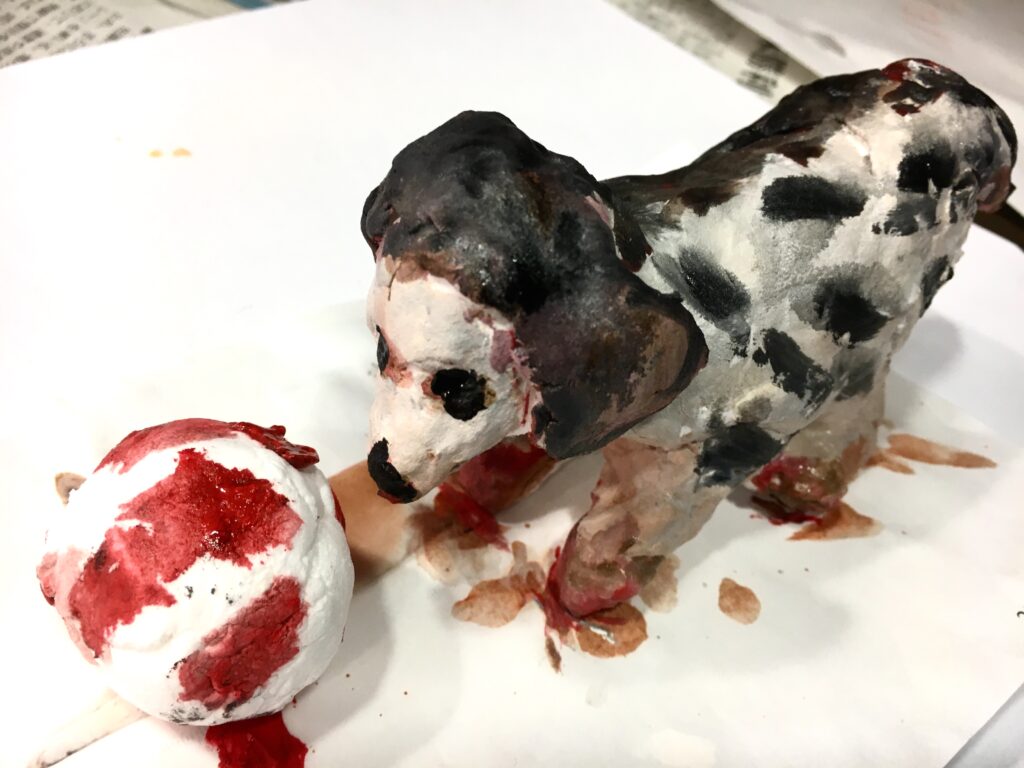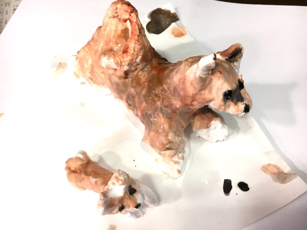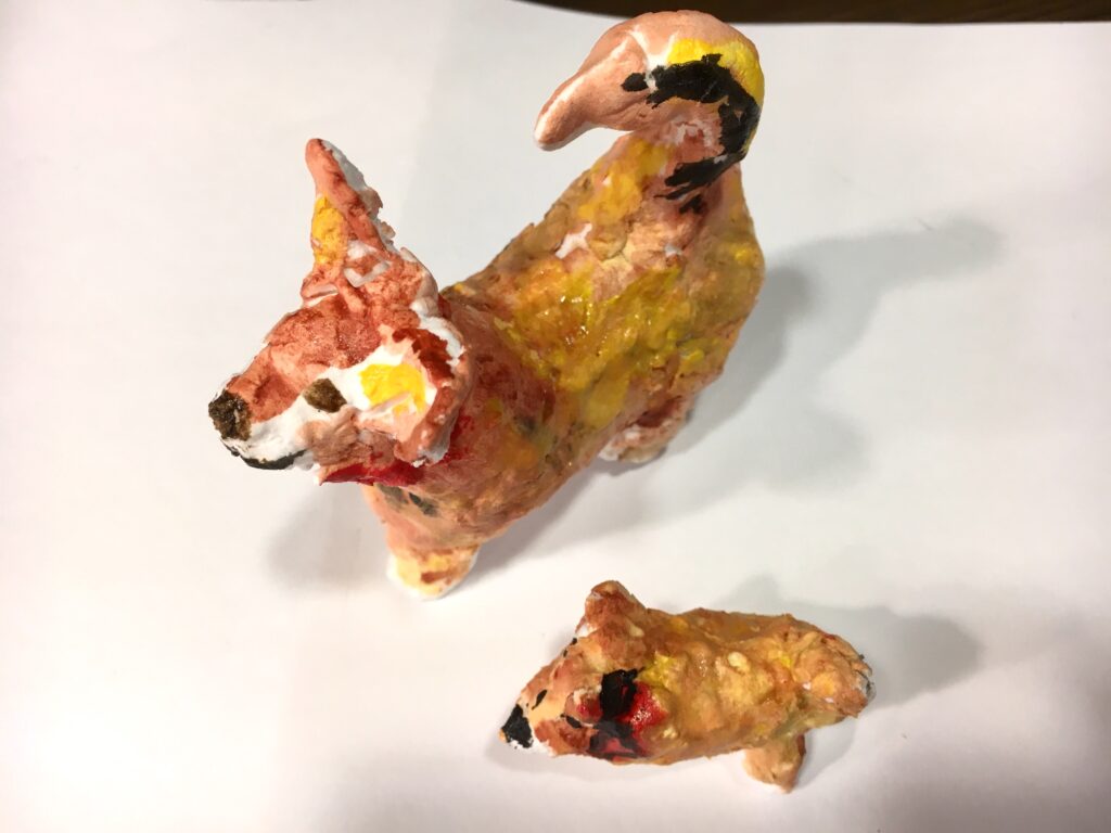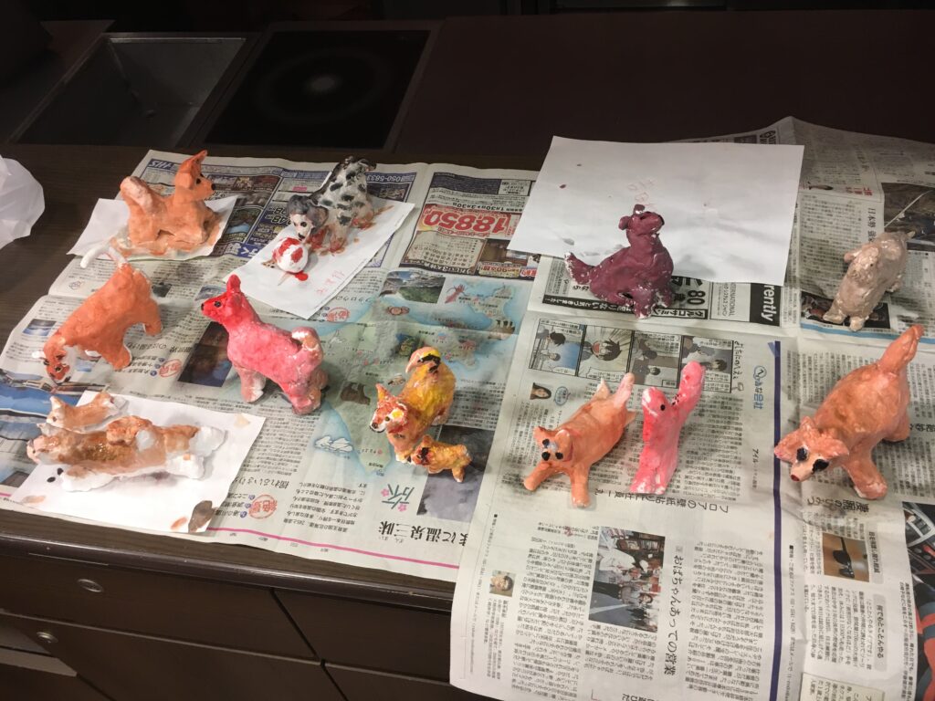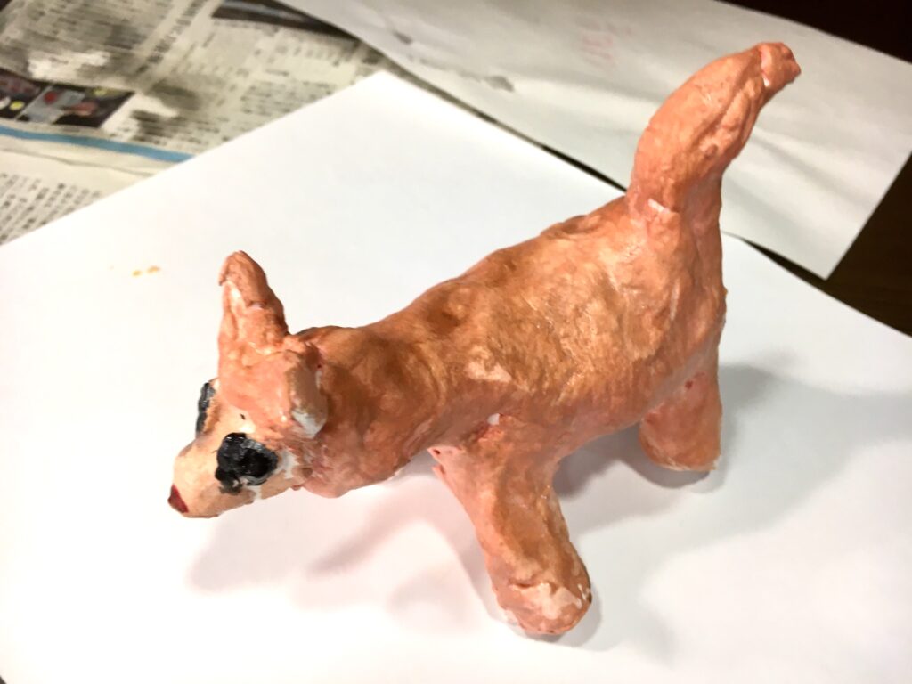 紙粘土で制作しながら、体をつくり、足をつくり、耳をつくる。鼻を伸ばすと、愛犬の顔がきっと目に浮かんでいたことと思う。制作しながら、愛しんでいた愛犬の話をしてくださる方も多くいらしたから。