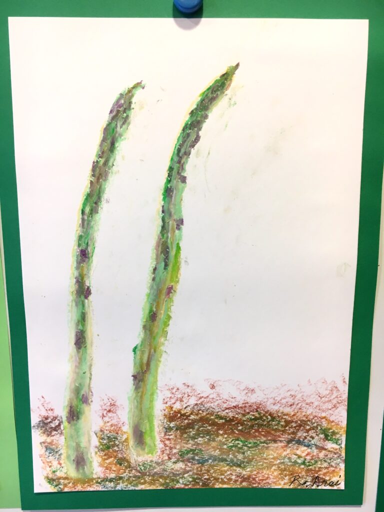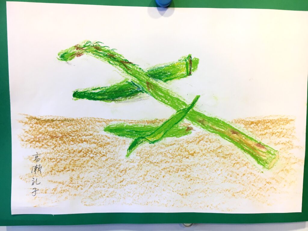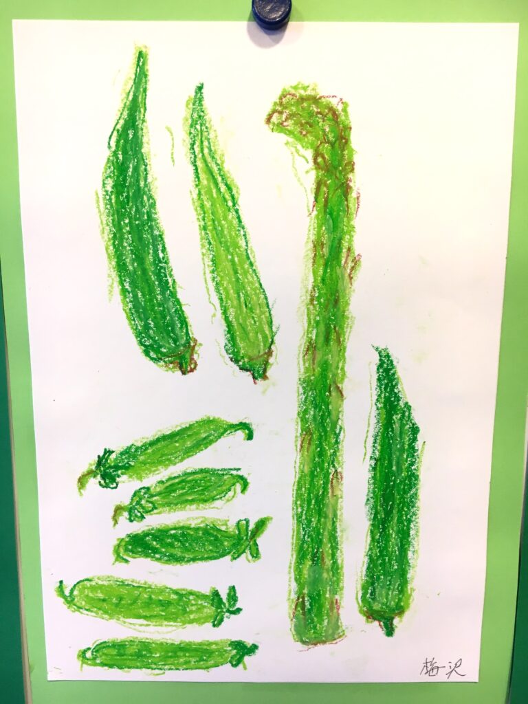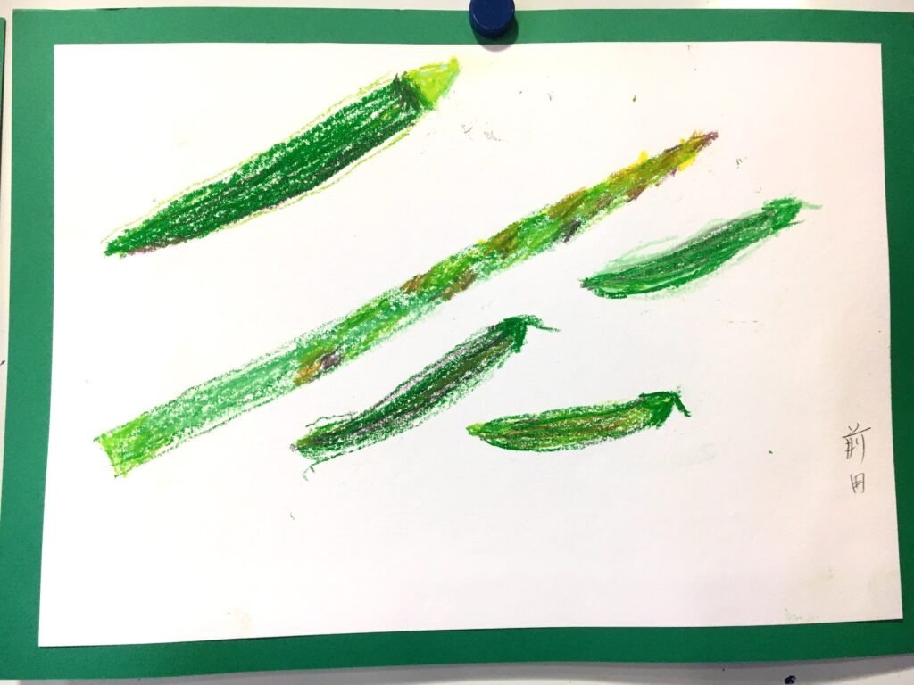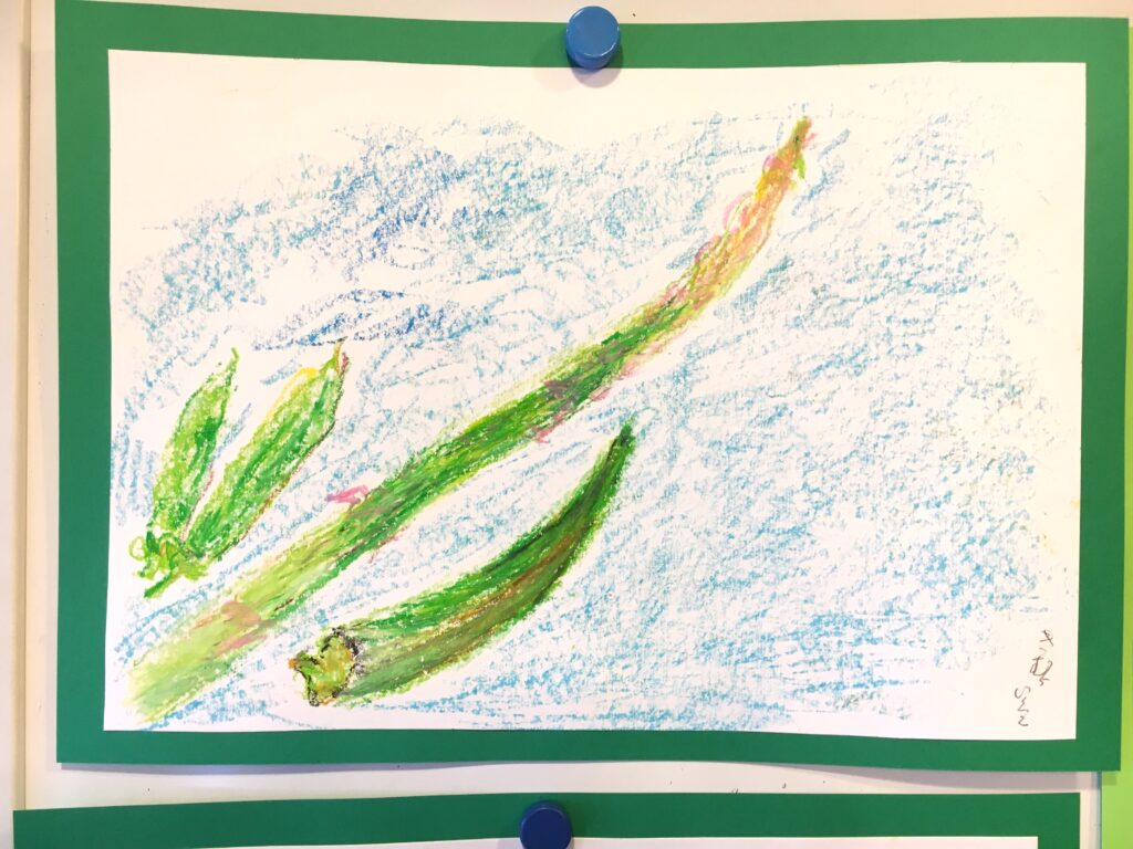 They carefully observed the slender shape of the asparagus, the plump pods of the green beans filled with beans, and the sturdy triangular shape of the okra. Hats off to them. This piece was also completed as a work of art by combining coloured paper as backing onto white drawing paper.