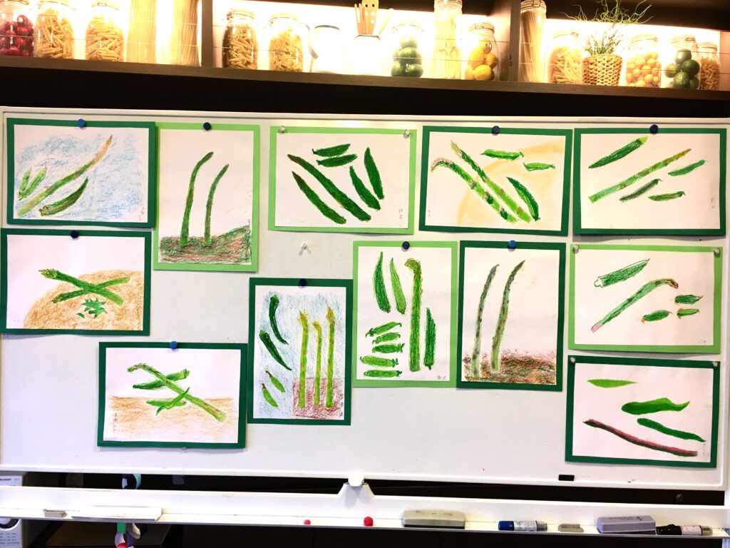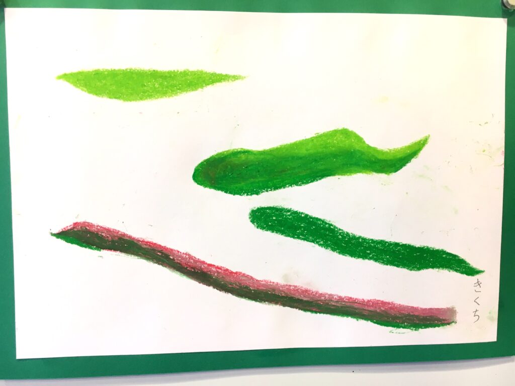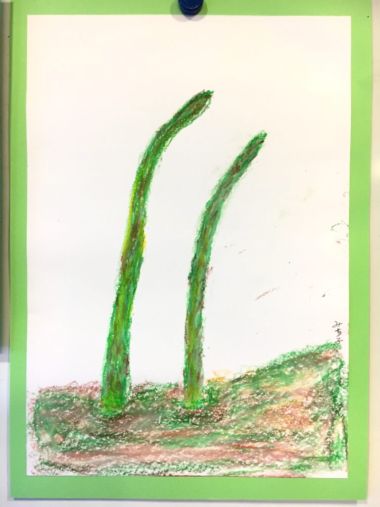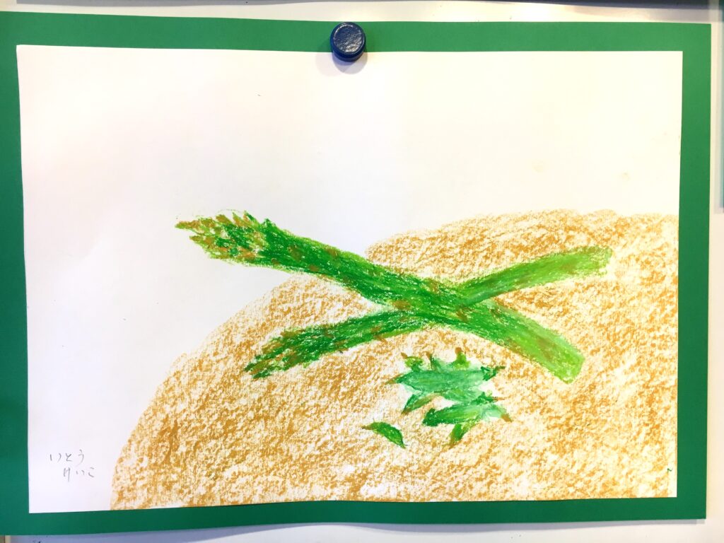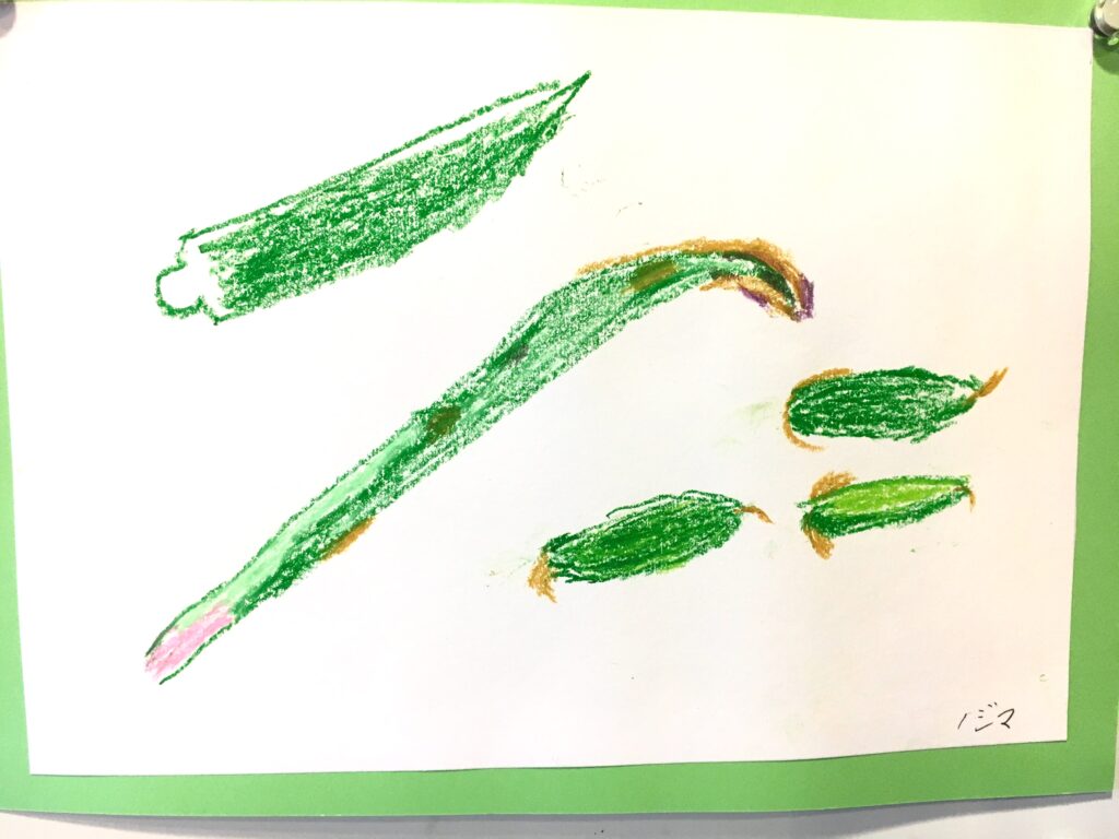 They carefully observed the slender shape of the asparagus, the plump pods of the green beans filled with beans, and the sturdy triangular shape of the okra. Hats off to them. This piece was also completed as a work of art by combining coloured paper as backing onto white drawing paper.