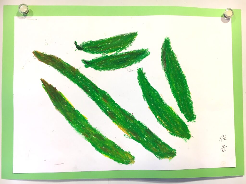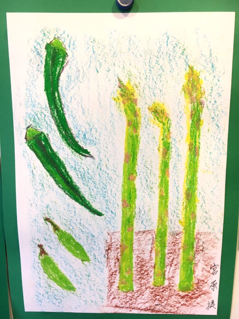 アスパラガスの細長い形、さやいんげんの豆の入ったふくらみ、オクラのしっかりとした三角を丁寧に観察されている。脱帽だ。この課題も白画用紙に台紙として色画用紙を組み合わせて作品として仕上げている。