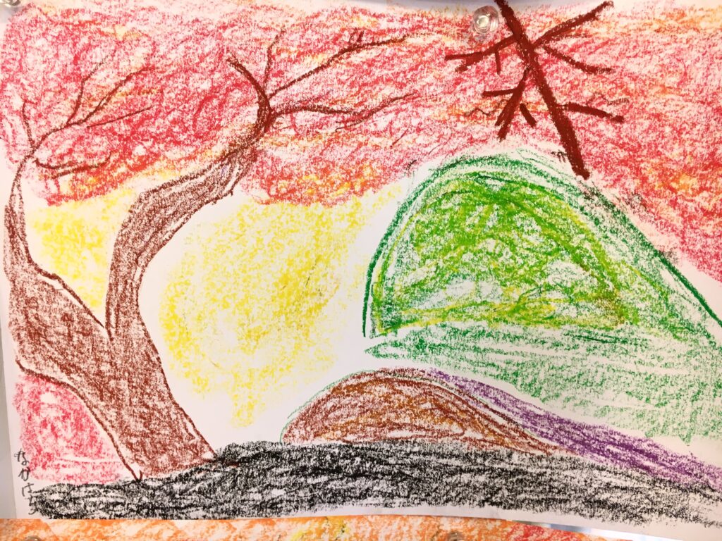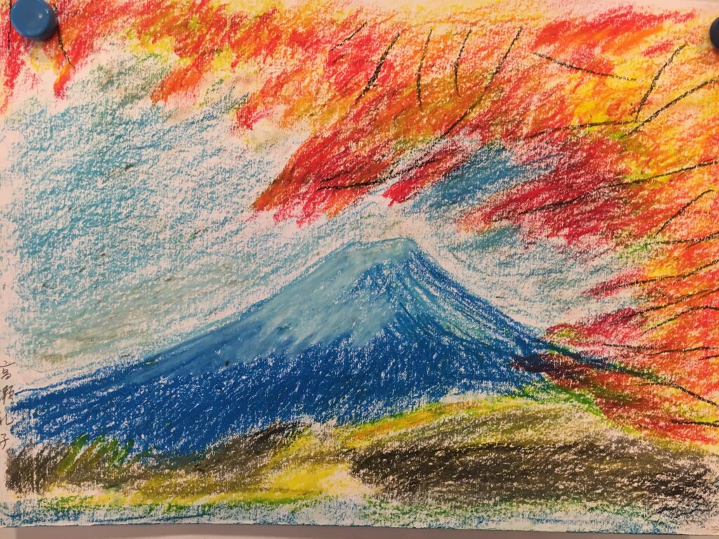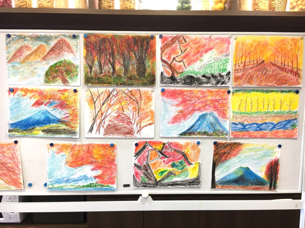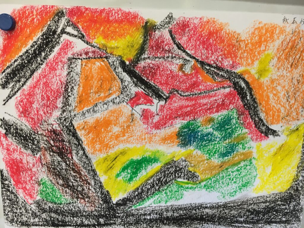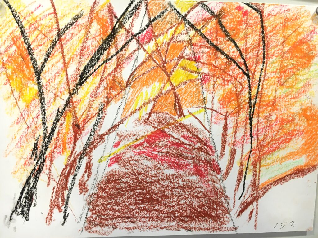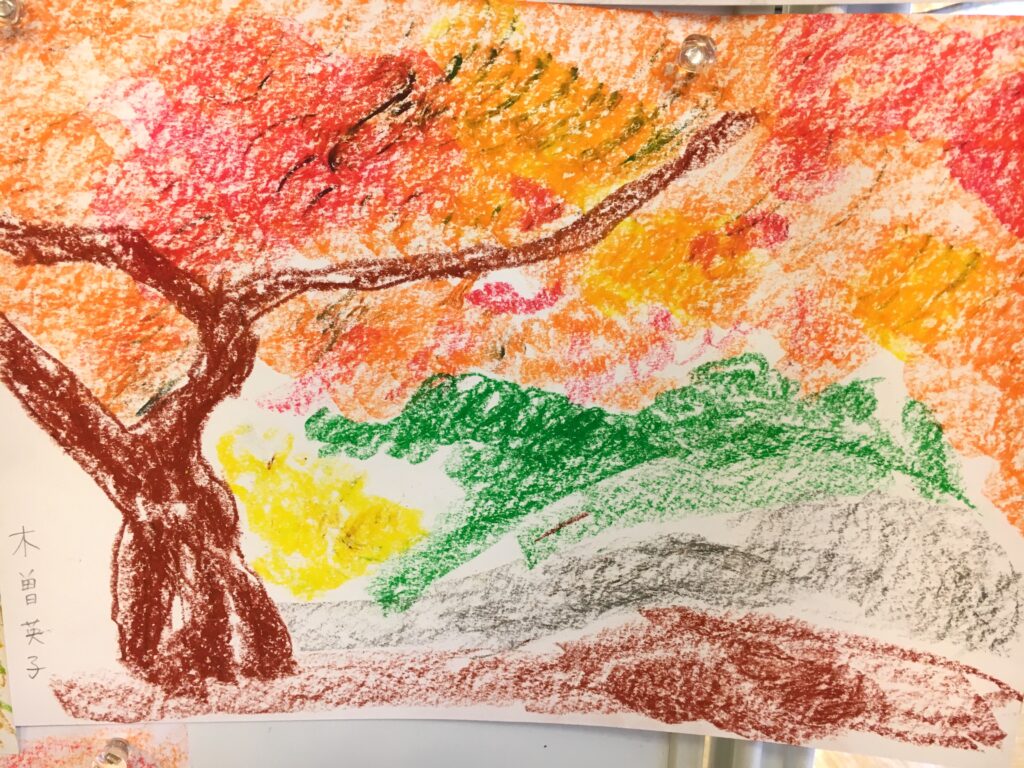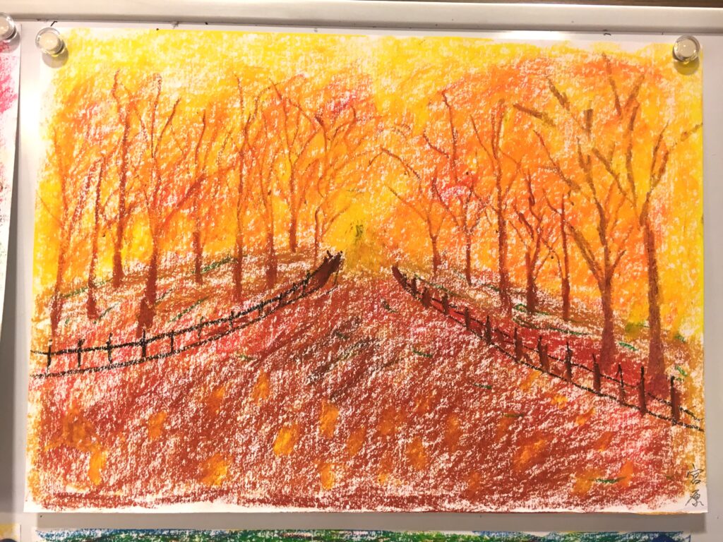 紅葉をパステルで自由に描いていただく。ある方は黄金色に実った畑を、銀杏で黄色に染まった街路樹の道を、桜の時期のピンク色とはちがって、紅葉は色鮮やかで豊かな実りを描く方が多かった。
