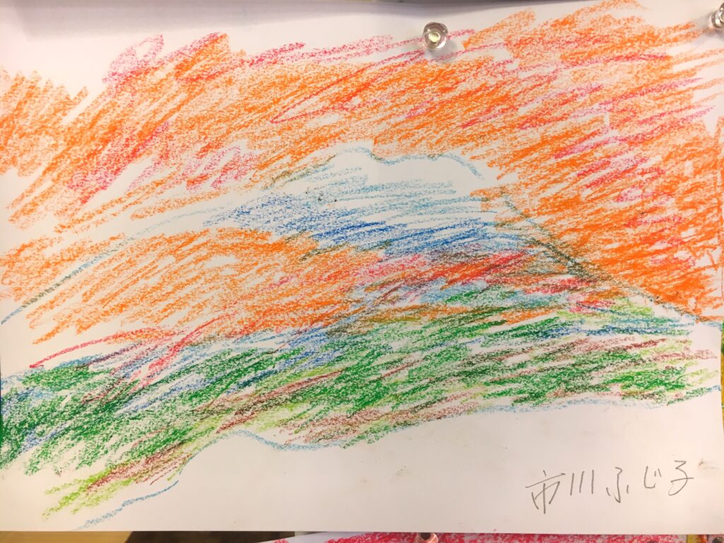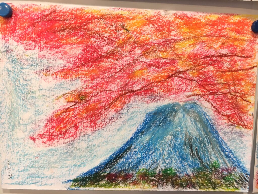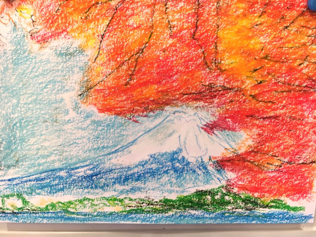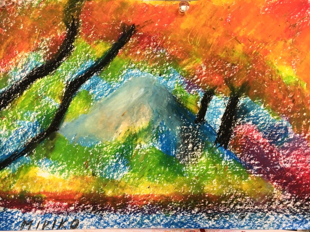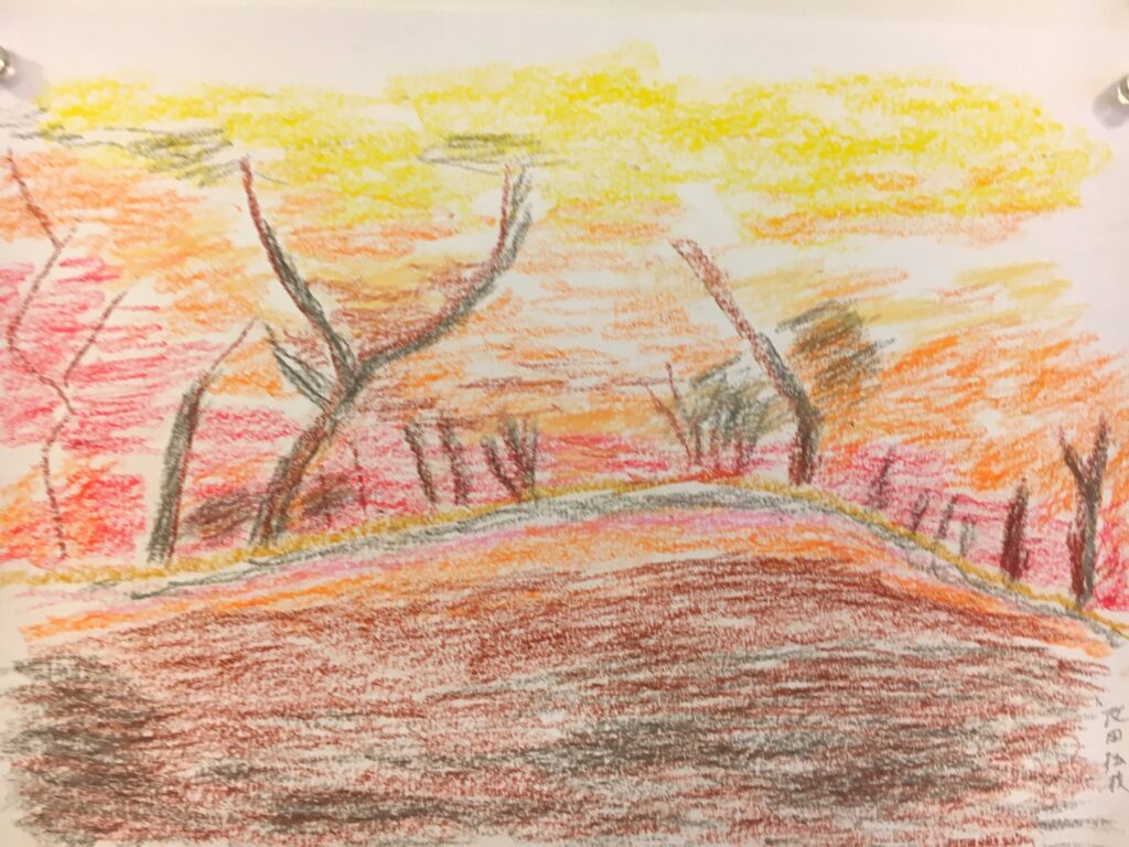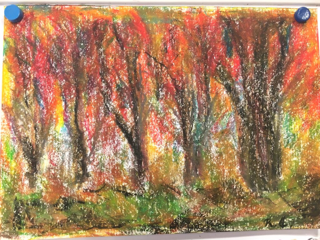 紅葉をパステルで自由に描いていただく。ある方は黄金色に実った畑を、銀杏で黄色に染まった街路樹の道を、桜の時期のピンク色とはちがって、紅葉は色鮮やかで豊かな実りを描く方が多かった。