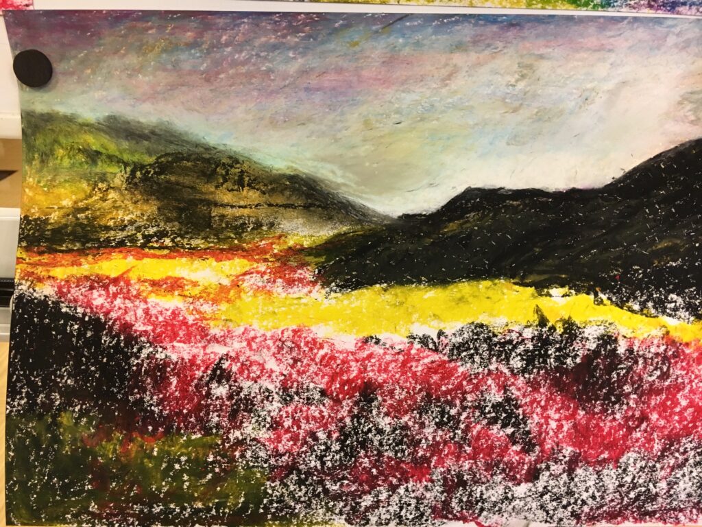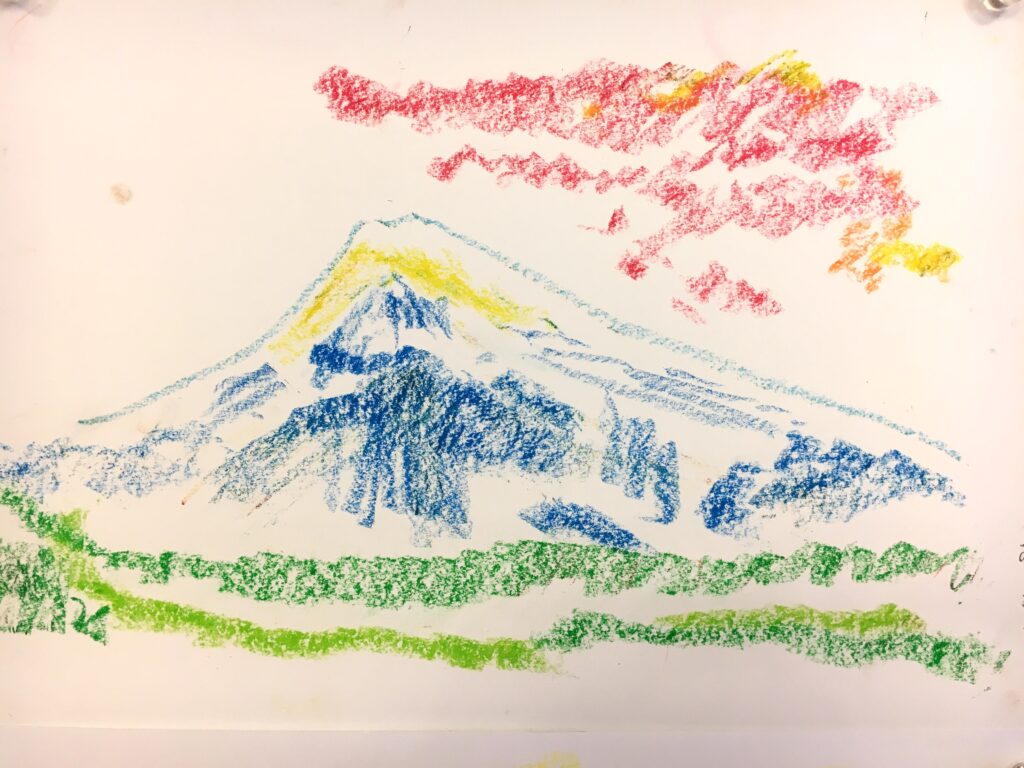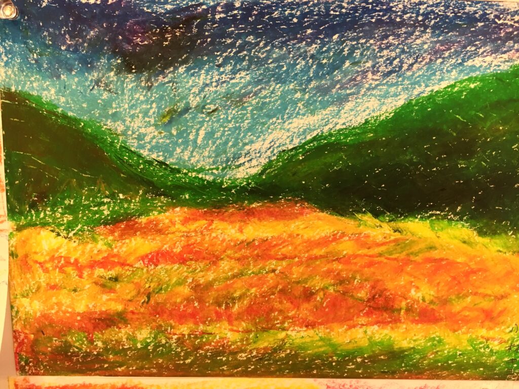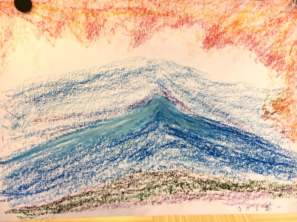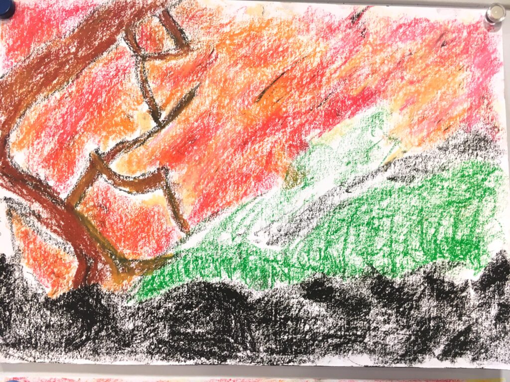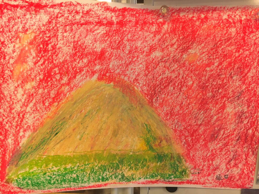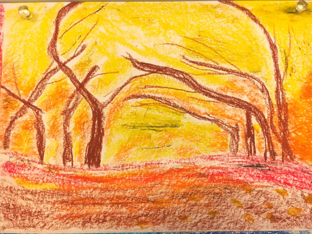 紅葉をパステルで自由に描いていただく。ある方は黄金色に実った畑を、銀杏で黄色に染まった街路樹の道を、桜の時期のピンク色とはちがって、紅葉は色鮮やかで豊かな実りを描く方が多かった。
