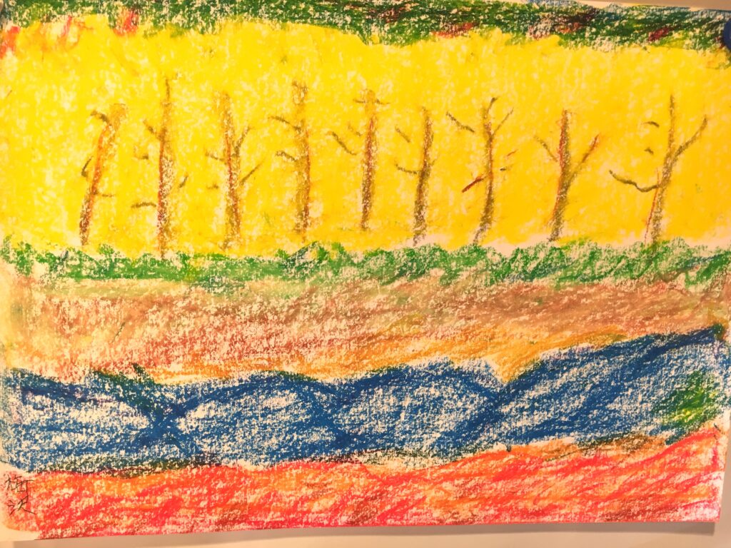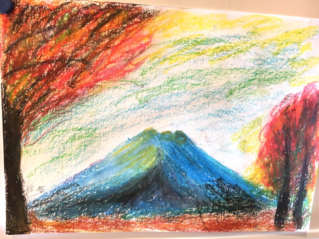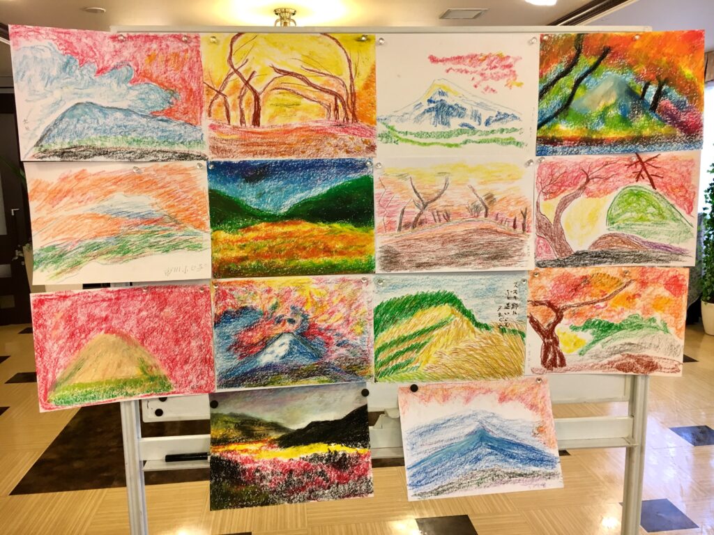 Participants freely painted autumn leaves in pastels. Many depicted fields ripening to golden hues, avenues lined with ginkgo trees turning yellow, and the vibrant, rich colours of autumn foliage—distinct from the pink of cherry blossom season—symbolising abundant harvest.