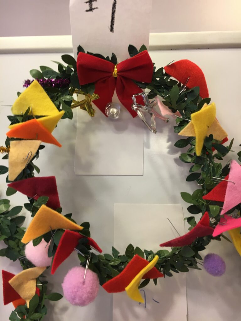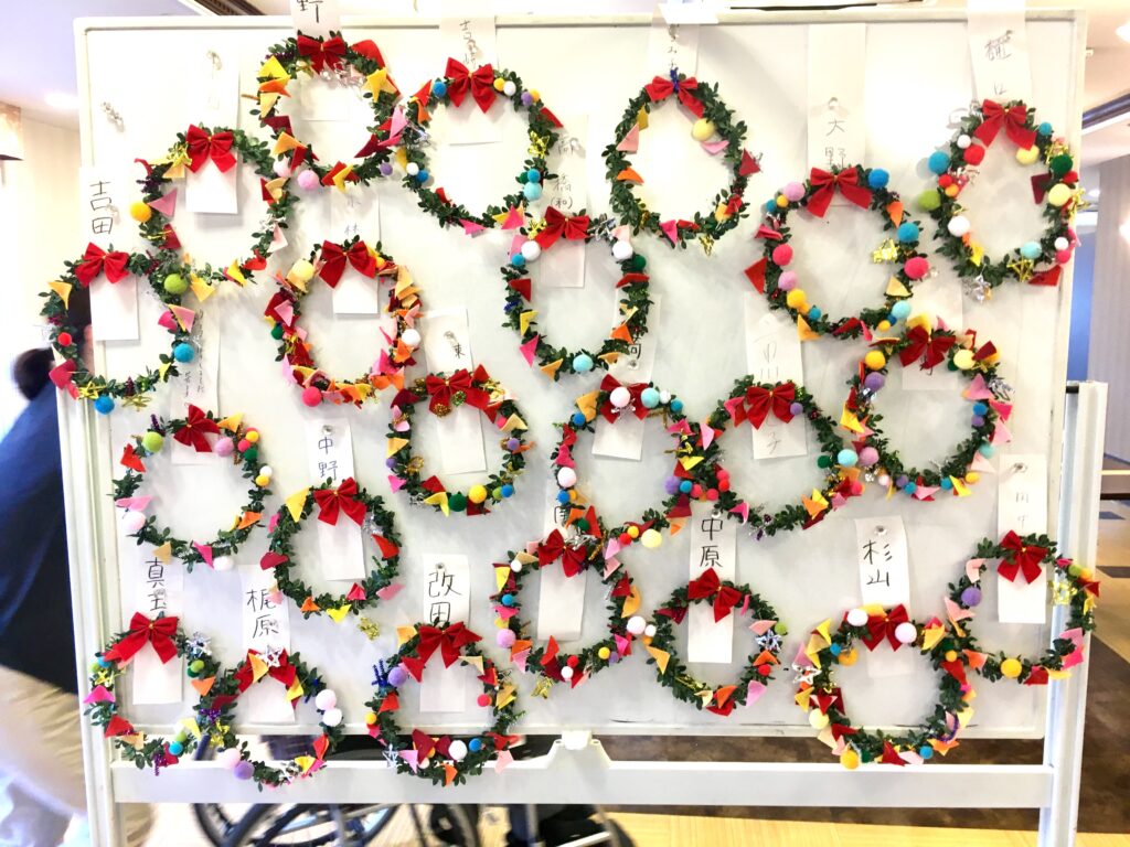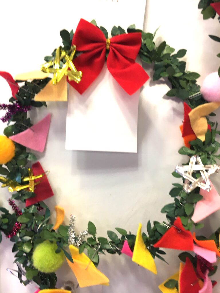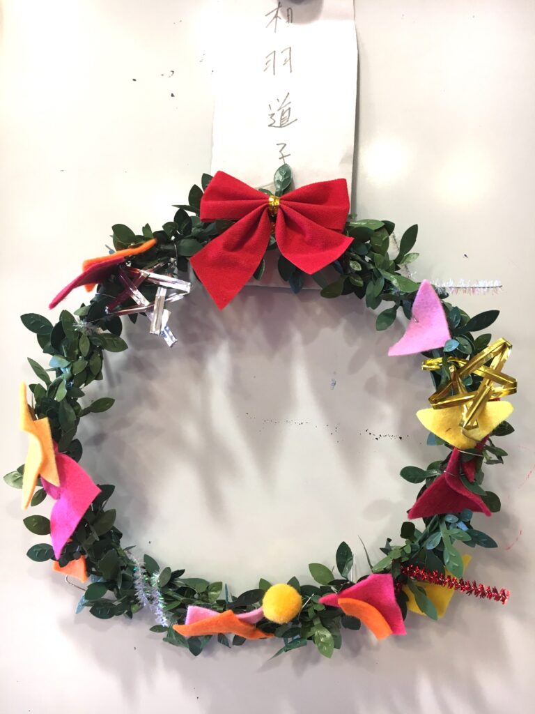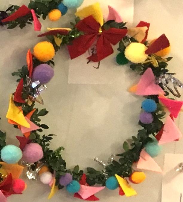 でも、どうやって90歳を越えた方々にも出来る作業にするのか。考えた結果、色とりどりのフエルトは三角形に切り、ボンボンと共に1つずつ細い針金をつけることで、リースの土台につけていただく。数量は膨大だったが、この準備作業にしばらくは没頭した。結果として、皆さんが喜んで楽しく制作されたことは言うまでもない。
