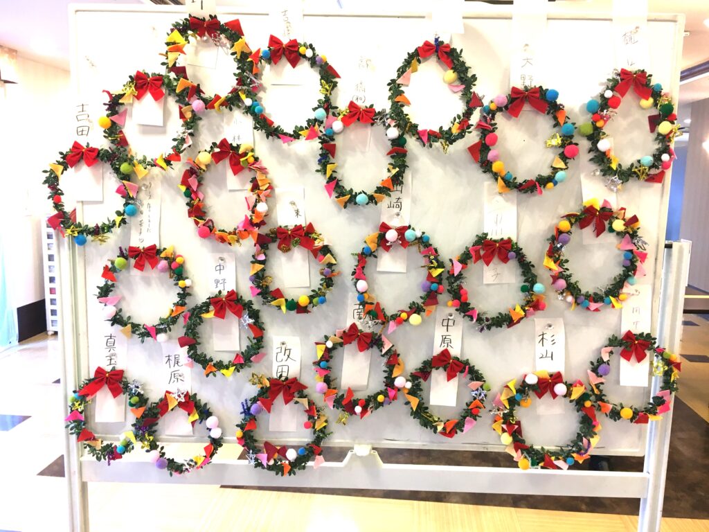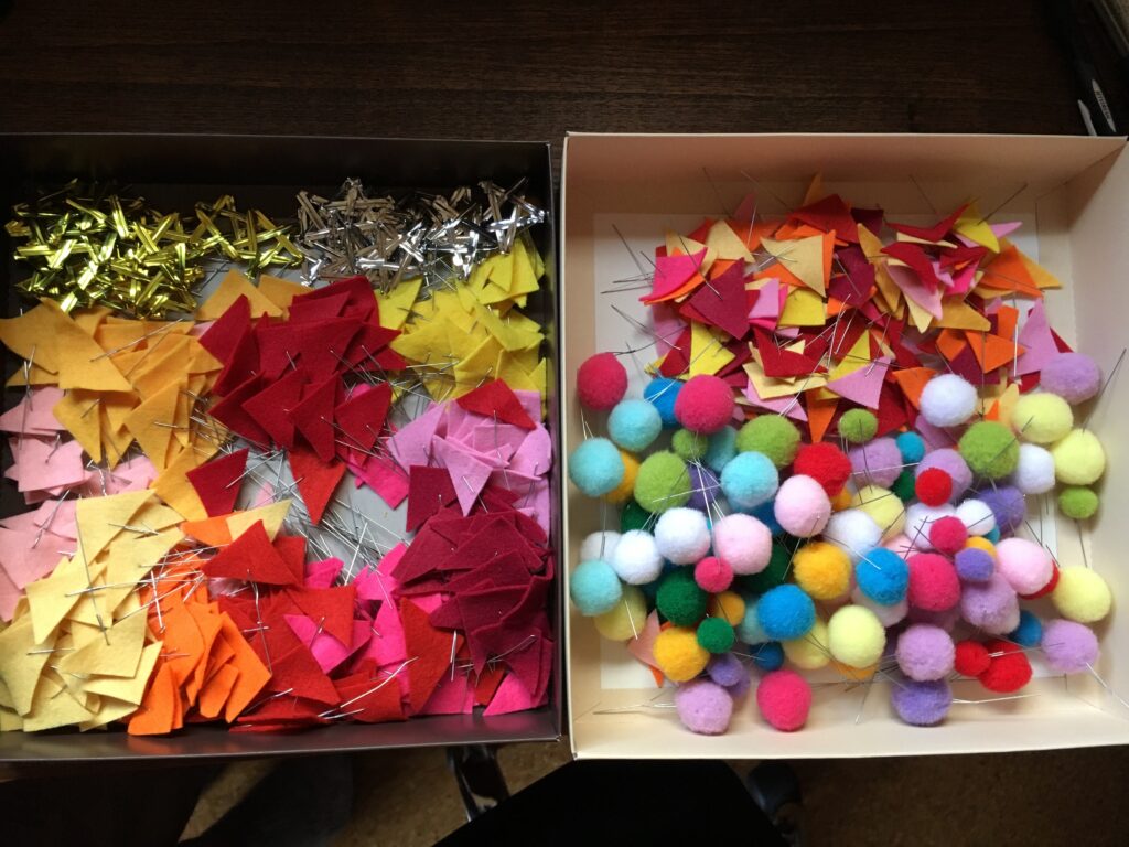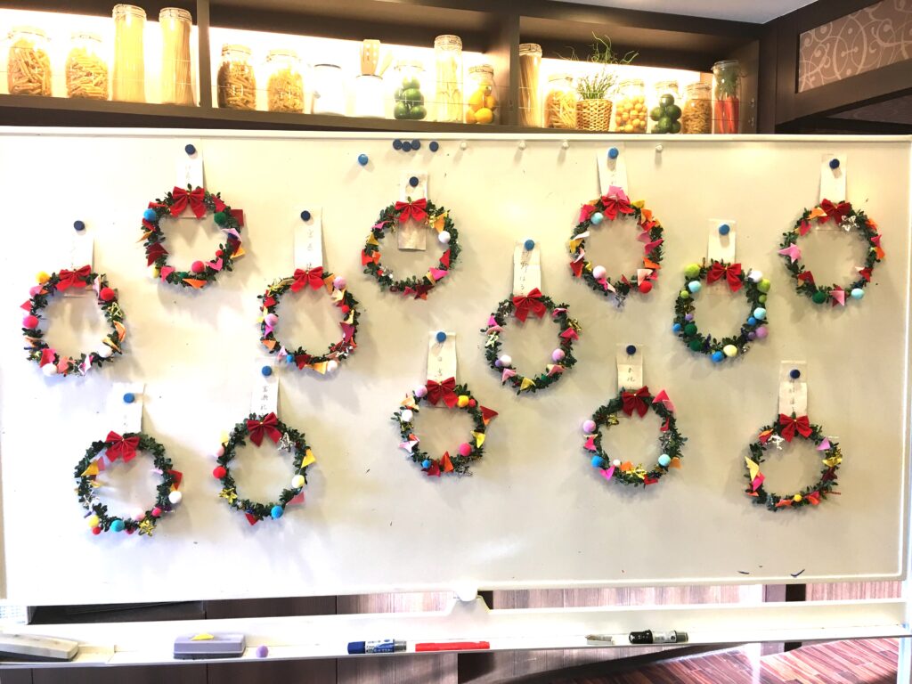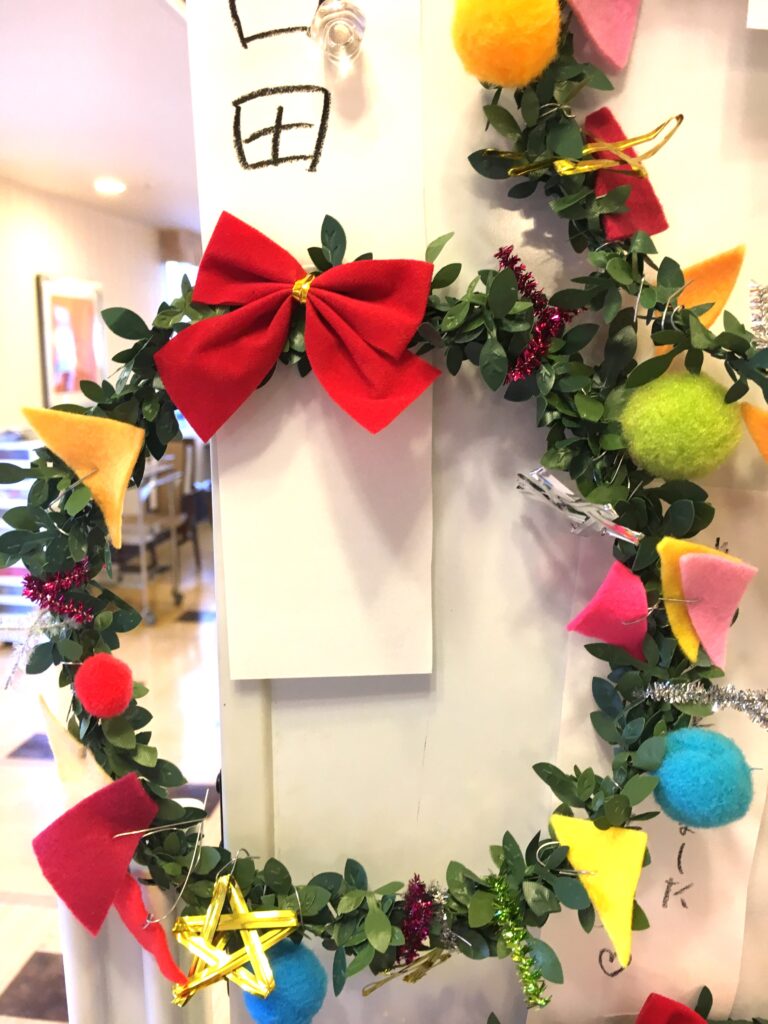 でも、どうやって90歳を越えた方々にも出来る作業にするのか。考えた結果、色とりどりのフエルトは三角形に切り、ボンボンと共に1つずつ細い針金をつけることで、リースの土台につけていただく。数量は膨大だったが、この準備作業にしばらくは没頭した。結果として、皆さんが喜んで楽しく制作されたことは言うまでもない。
