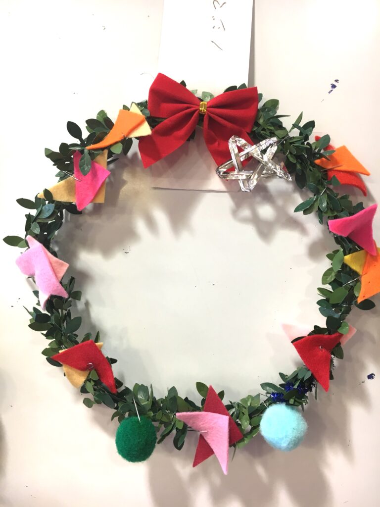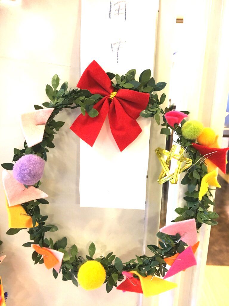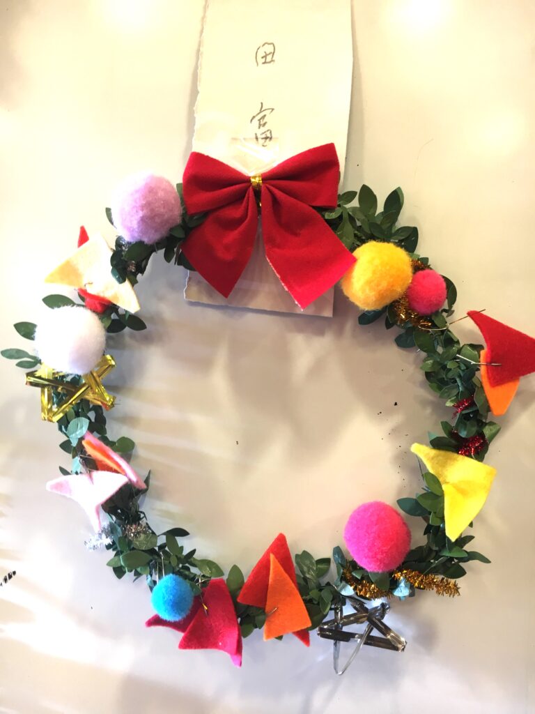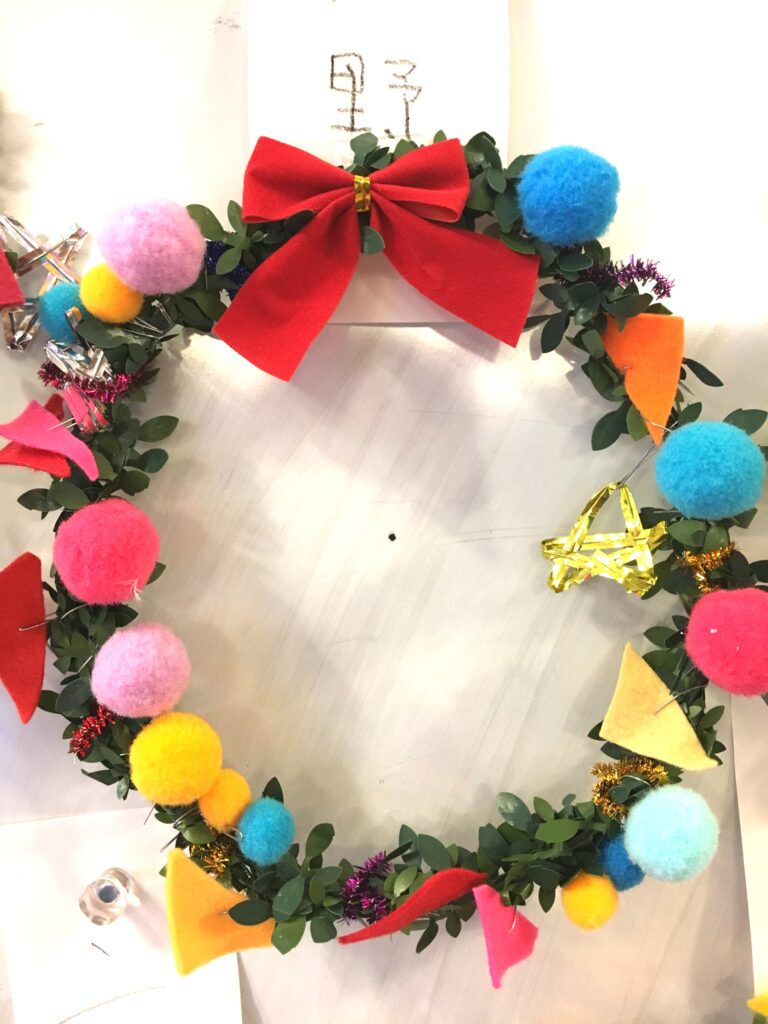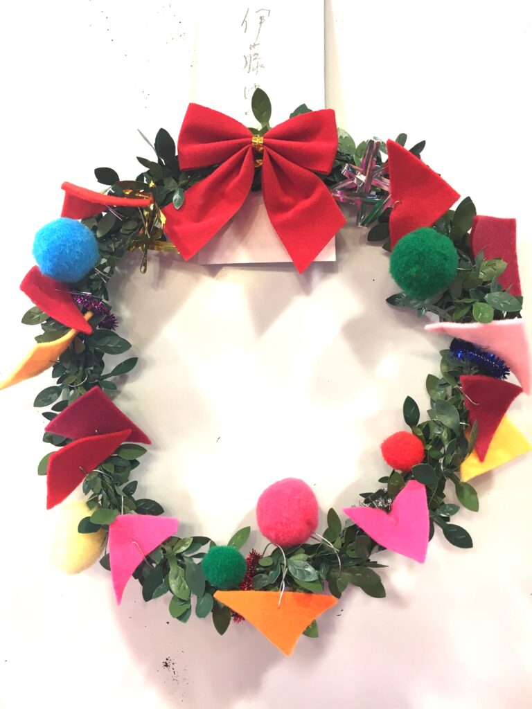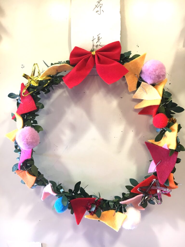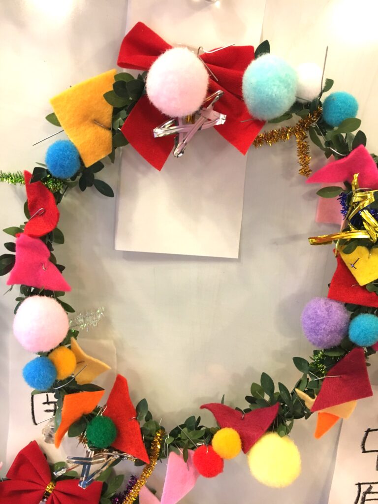 However, this proved a difficult challenge. How to make the base ring for the wreath? Wire was too stiff and lacked that wreath-like feel. Budget was also a factor. The 100-yen shop – an essential stop – was where I found artificial green vines, sparking my imagination. What if we decorated these with colourful felt and pom-poms?