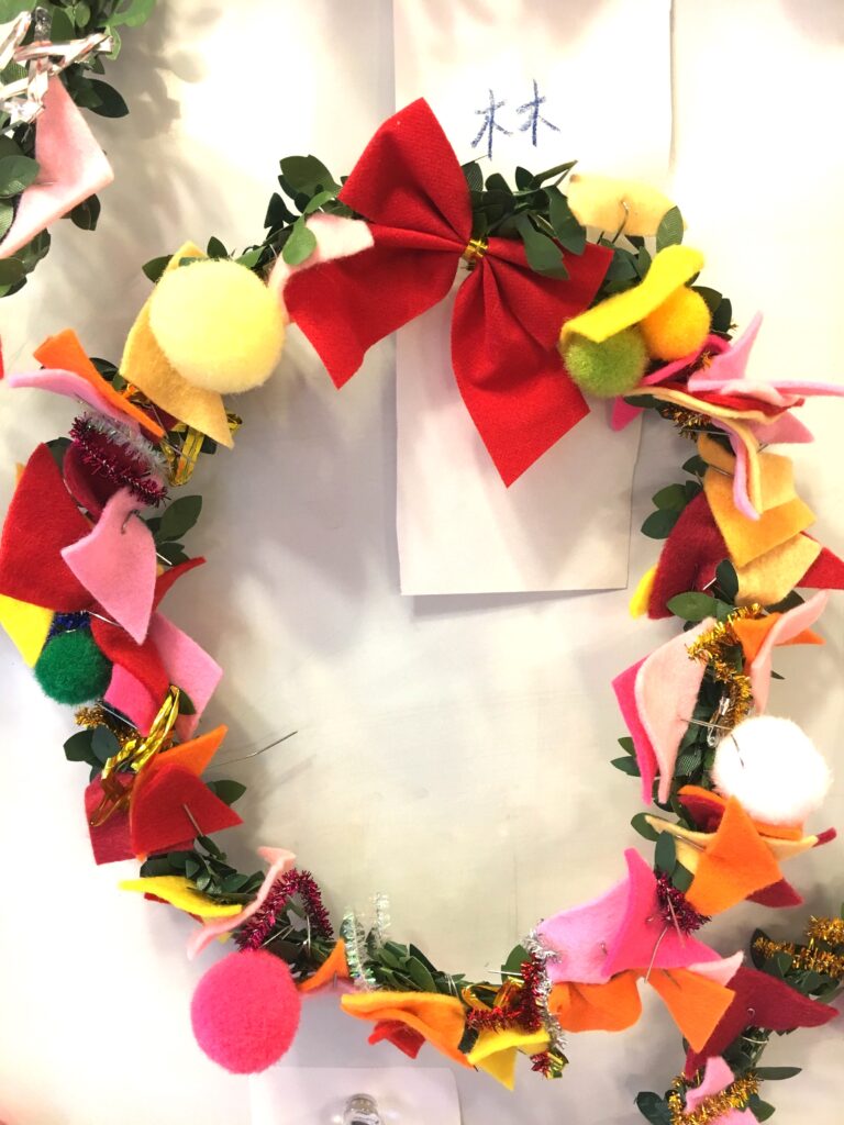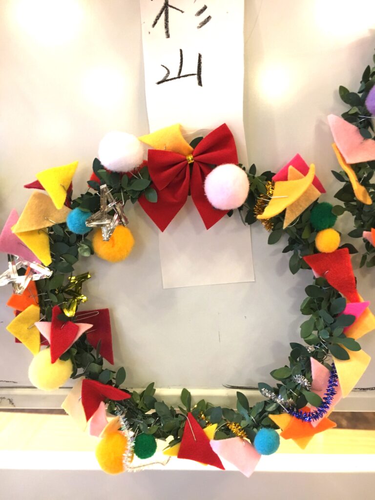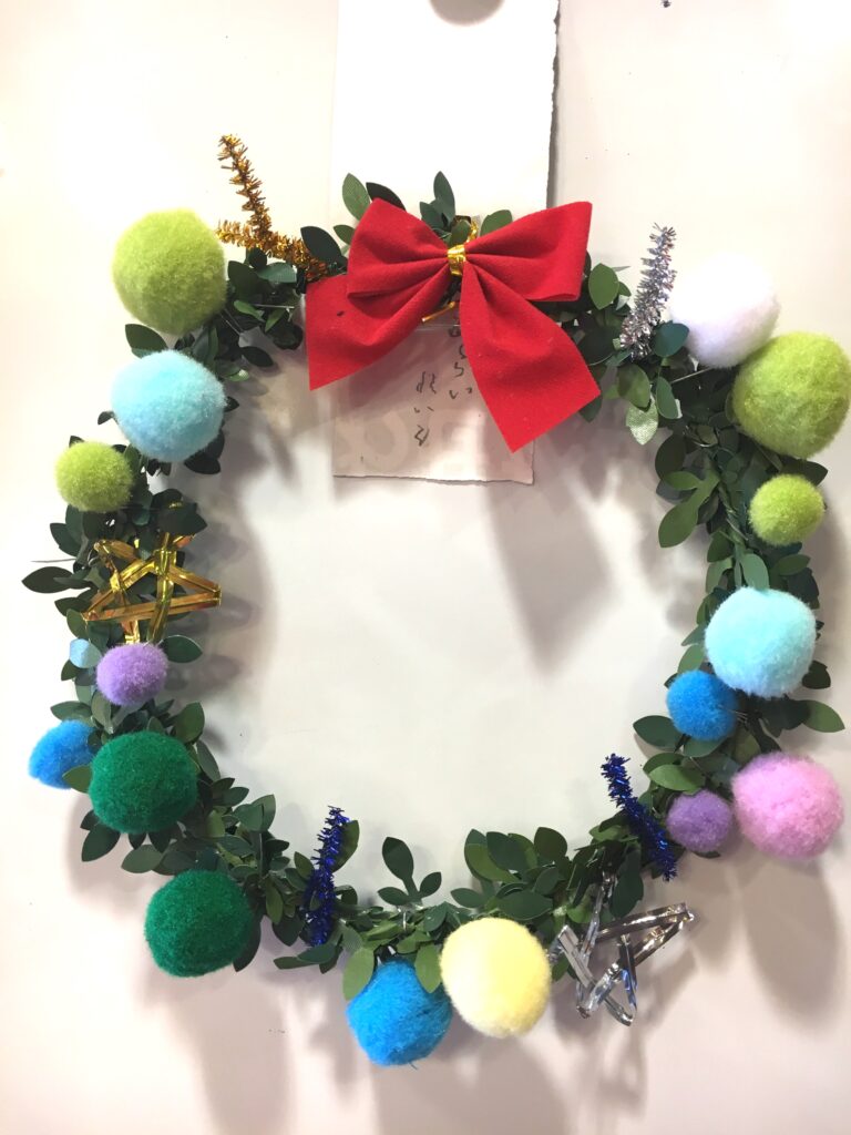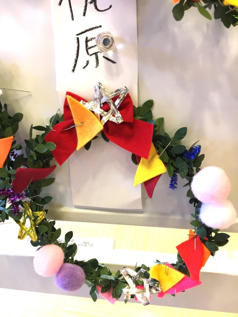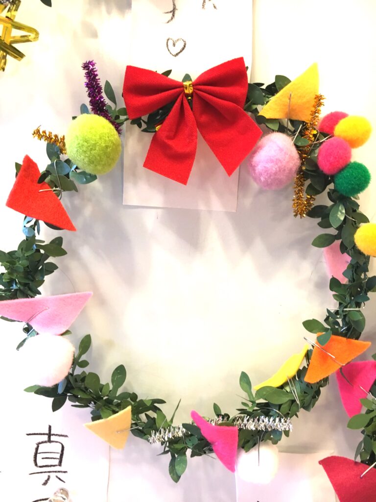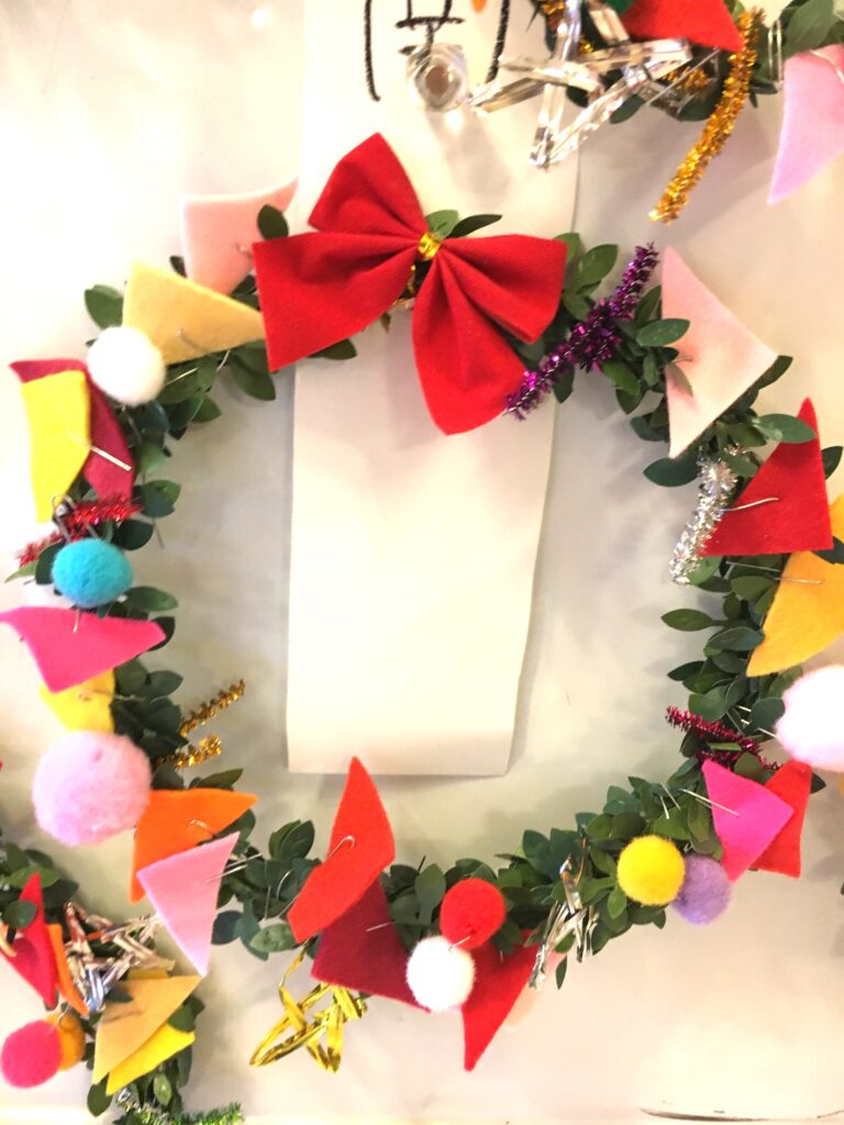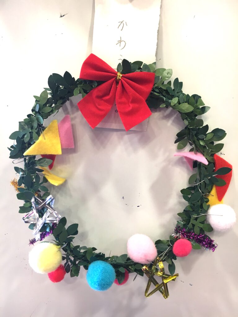 However, this proved a difficult challenge. How to make the base ring for the wreath? Wire was too stiff and lacked that wreath-like feel. Budget was also a factor. The 100-yen shop – an essential stop – was where I found artificial green vines, sparking my imagination. What if we decorated these with colourful felt and pom-poms?