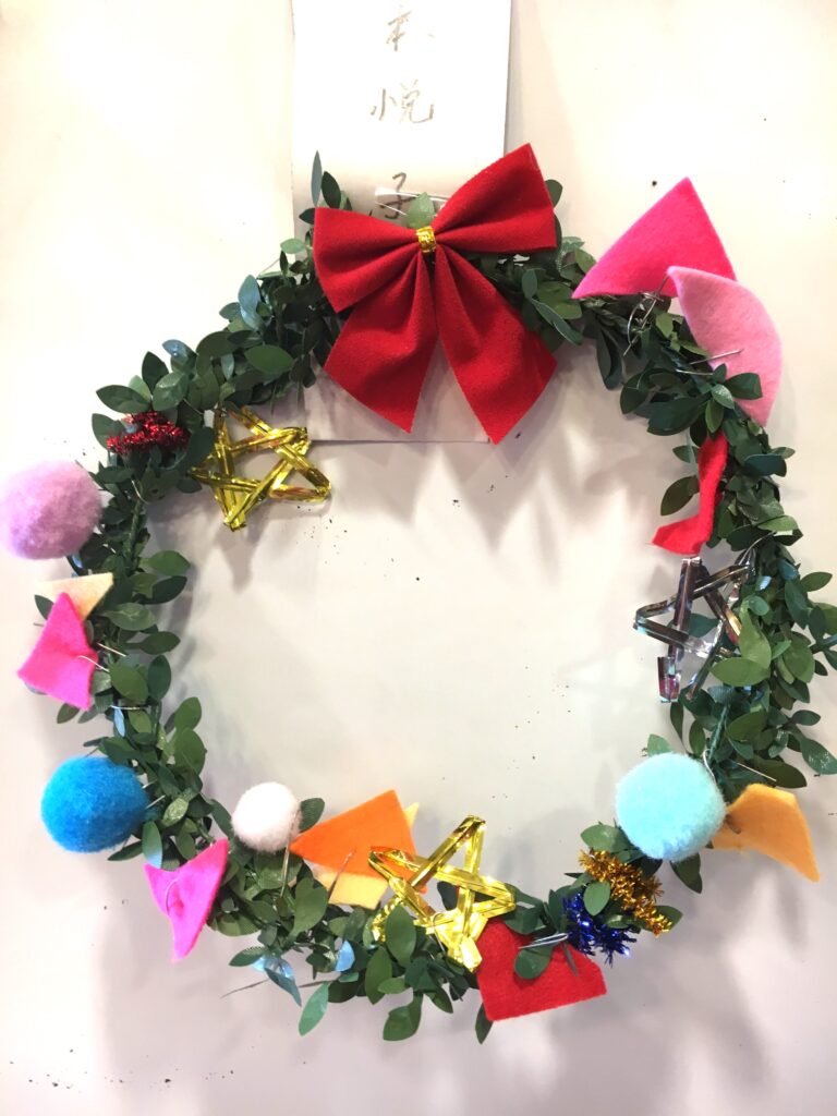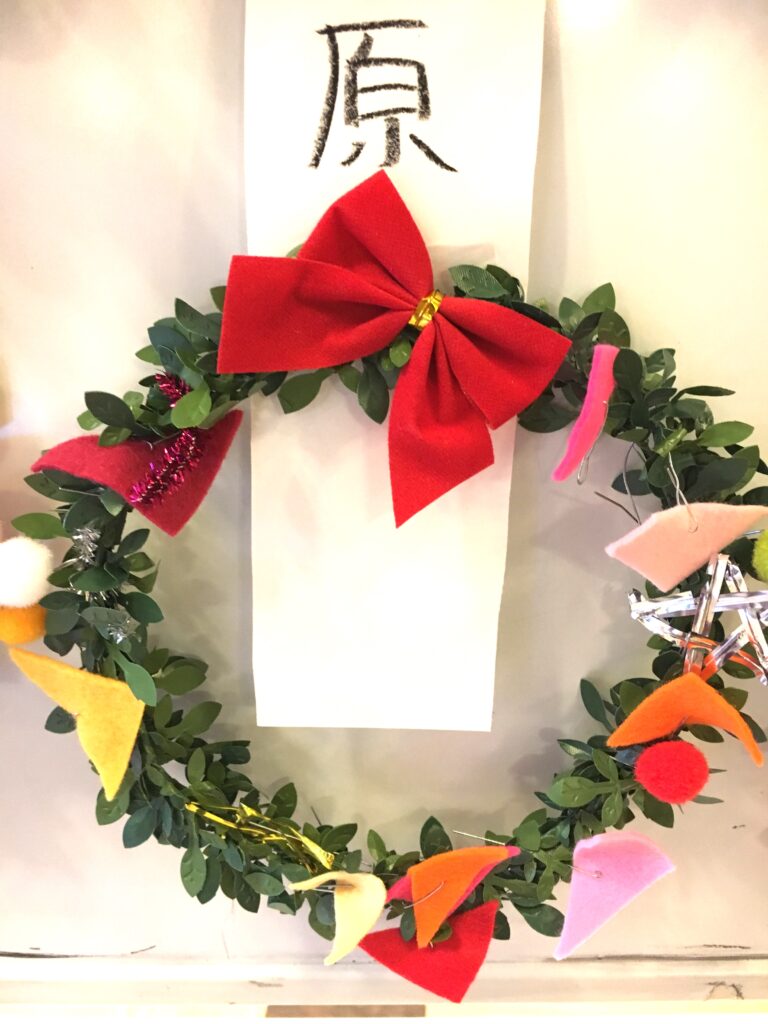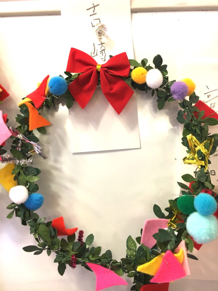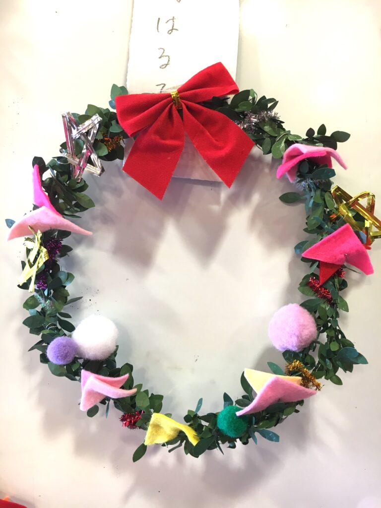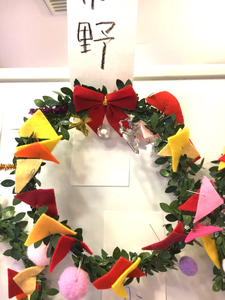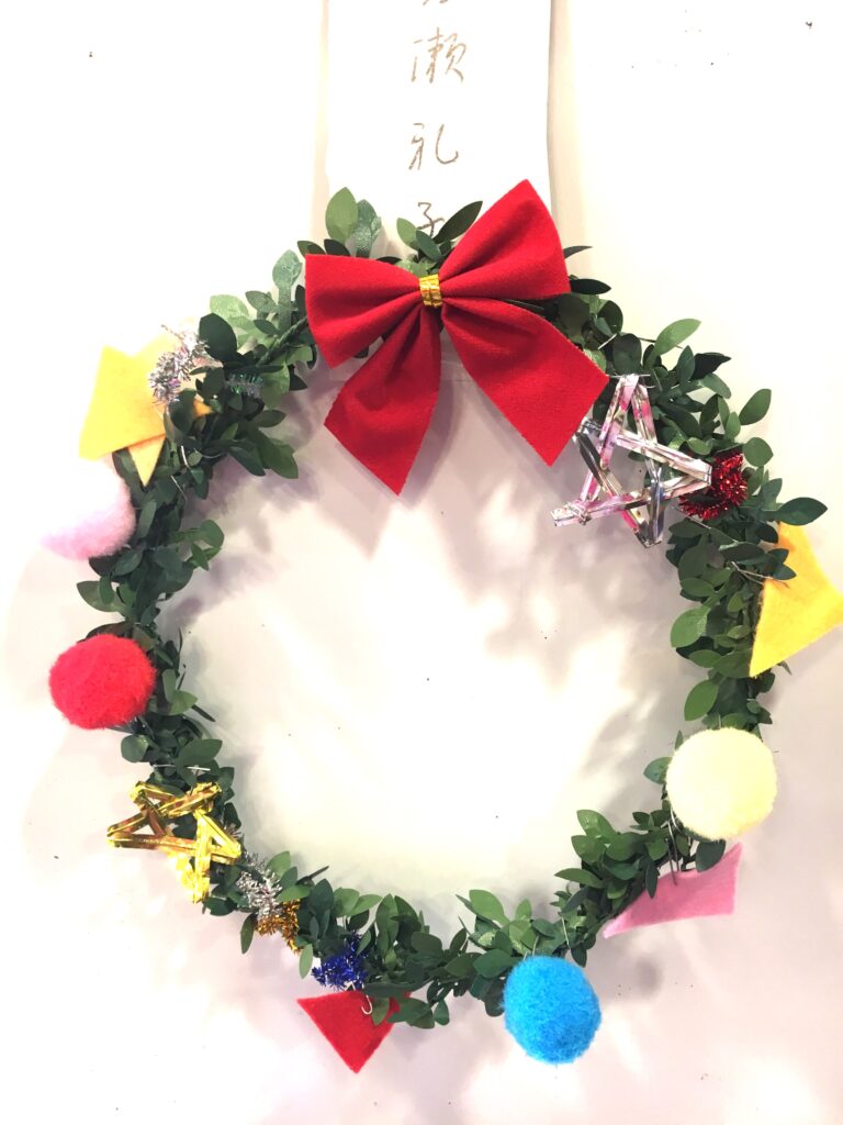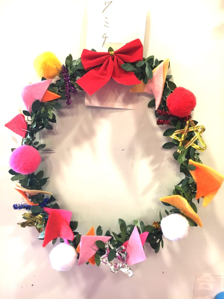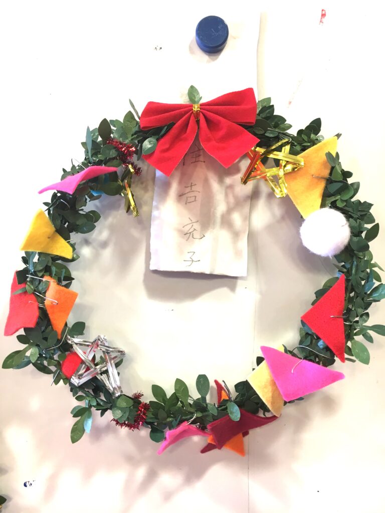 However, this proved a difficult challenge. How to make the base ring for the wreath? Wire was too stiff and lacked that wreath-like feel. Budget was also a factor. The 100-yen shop – an essential stop – was where I found artificial green vines, sparking my imagination. What if we decorated these with colourful felt and pom-poms?