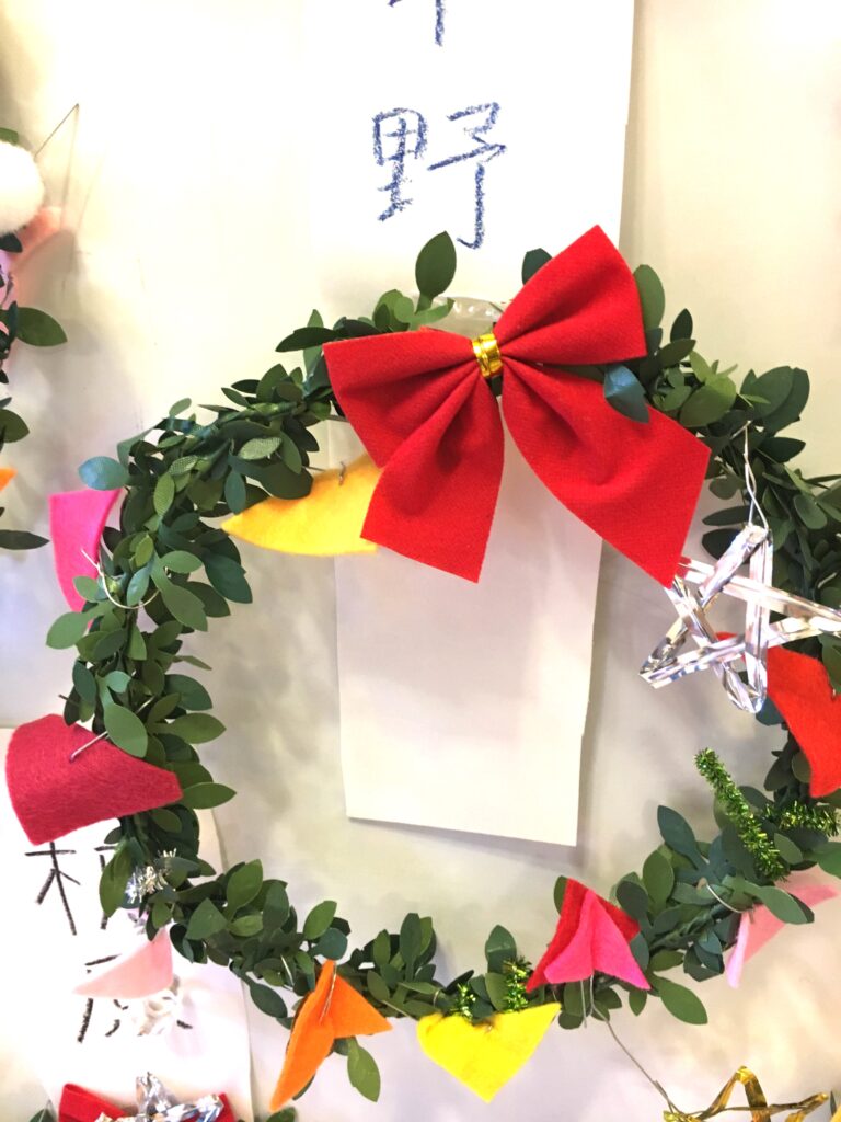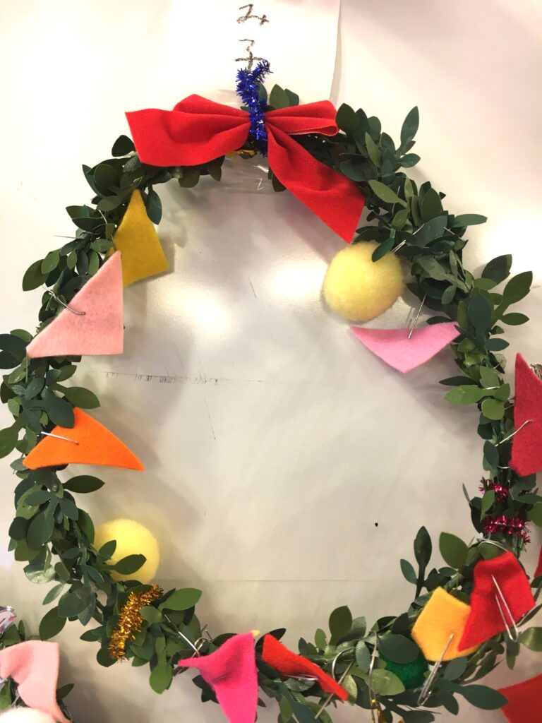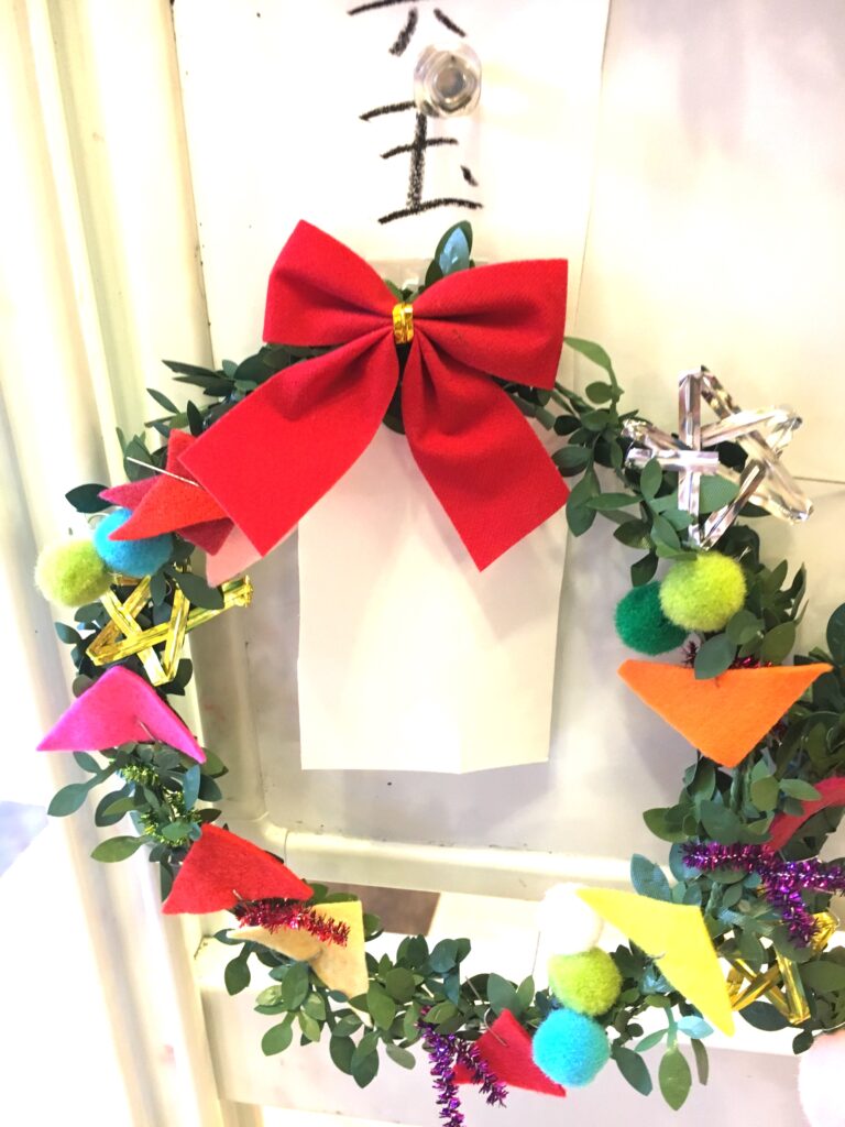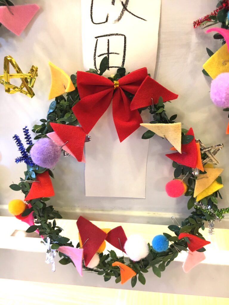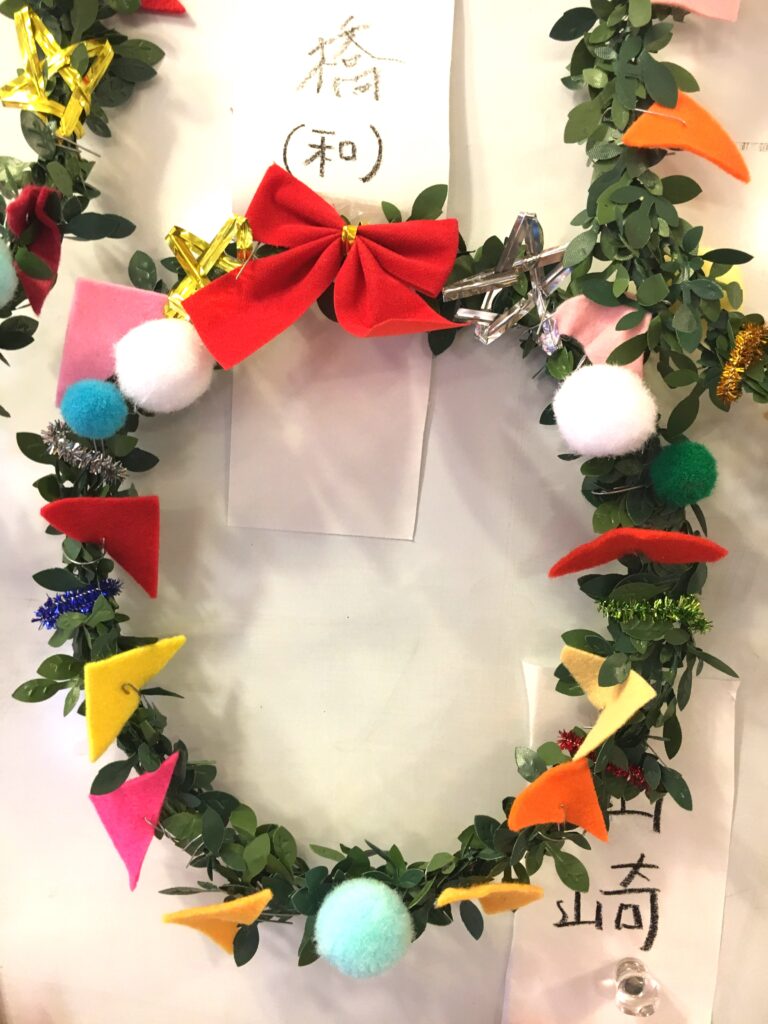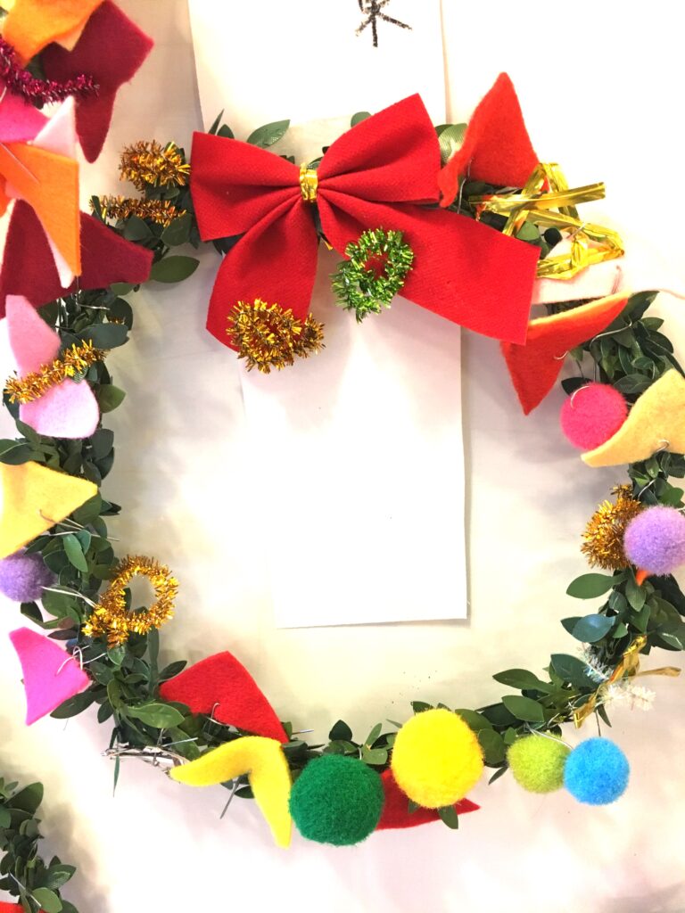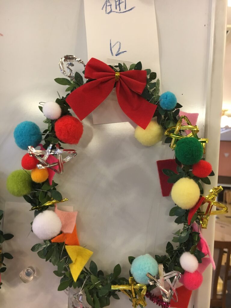 However, this proved a difficult challenge. How to make the base ring for the wreath? Wire was too stiff and lacked that wreath-like feel. Budget was also a factor. The 100-yen shop – an essential stop – was where I found artificial green vines, sparking my imagination. What if we decorated these with colourful felt and pom-poms?