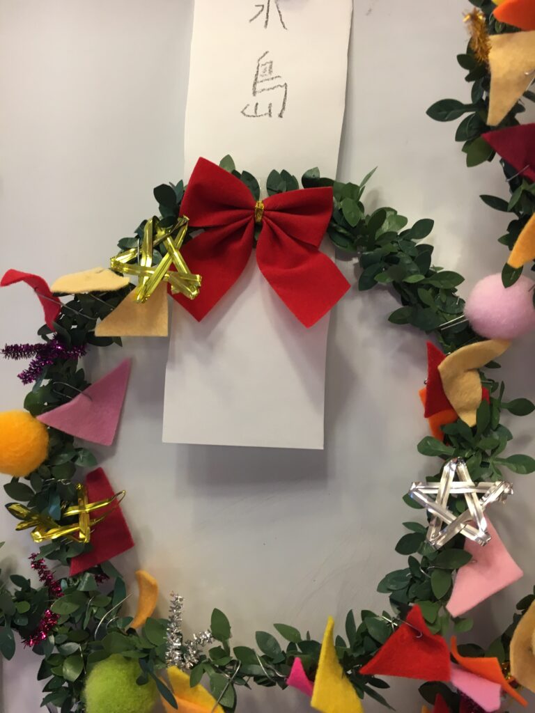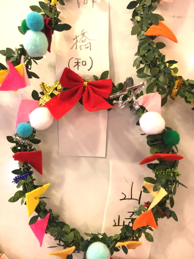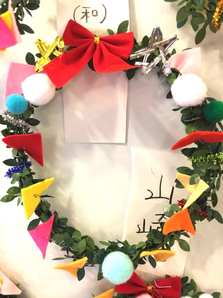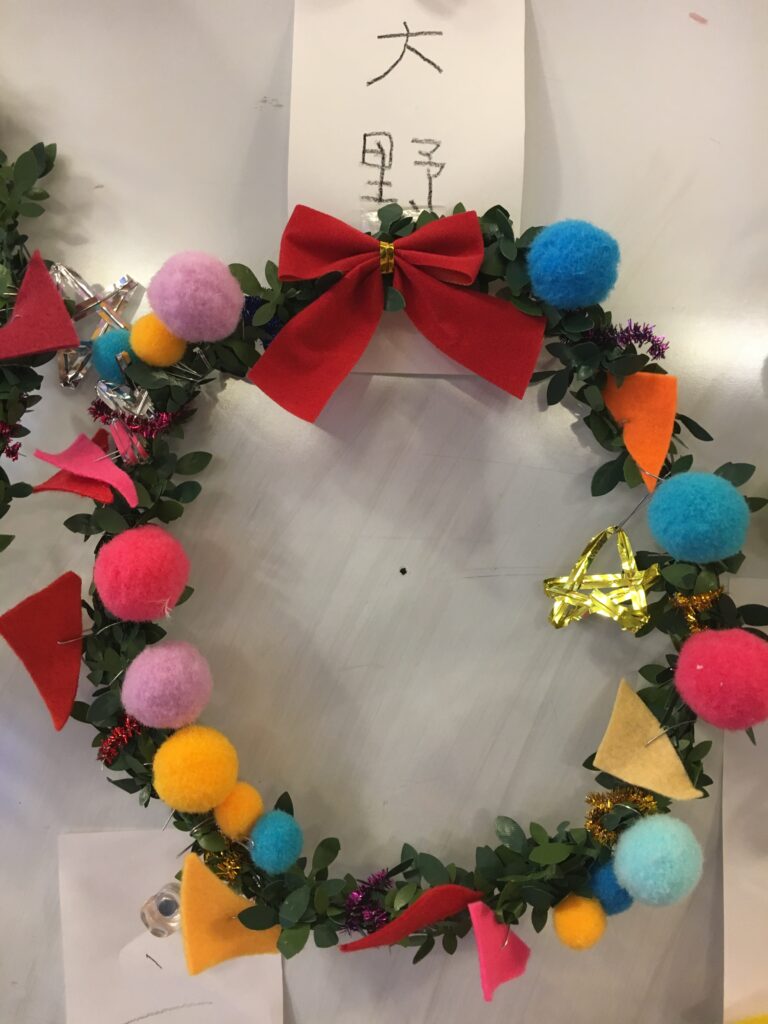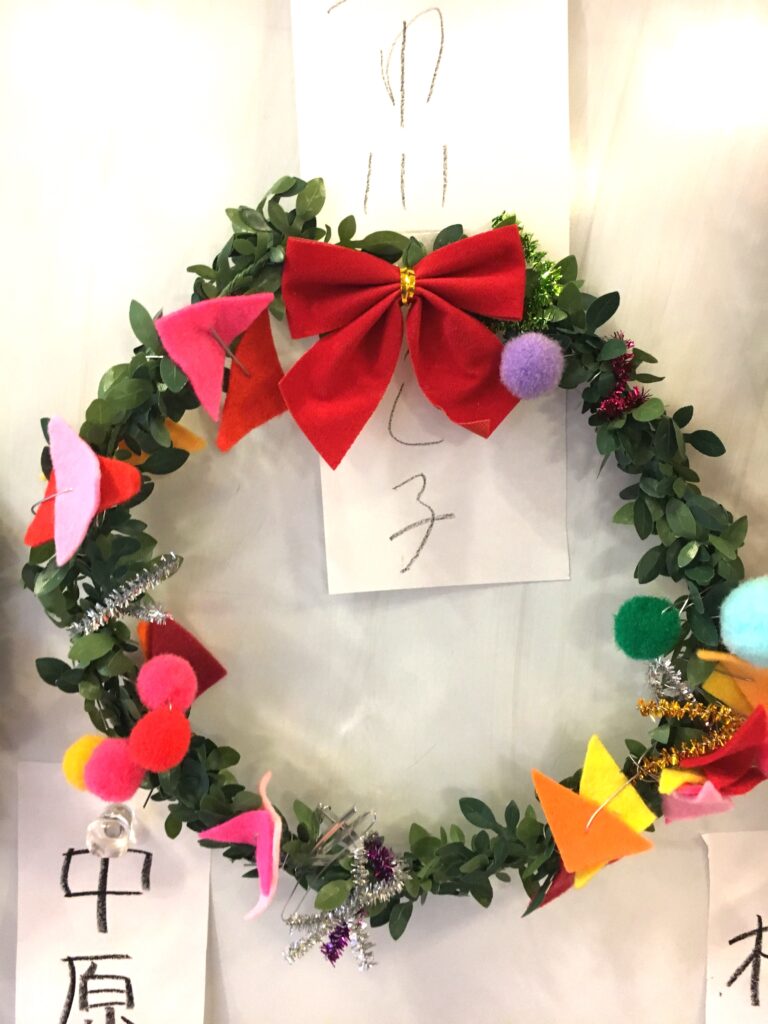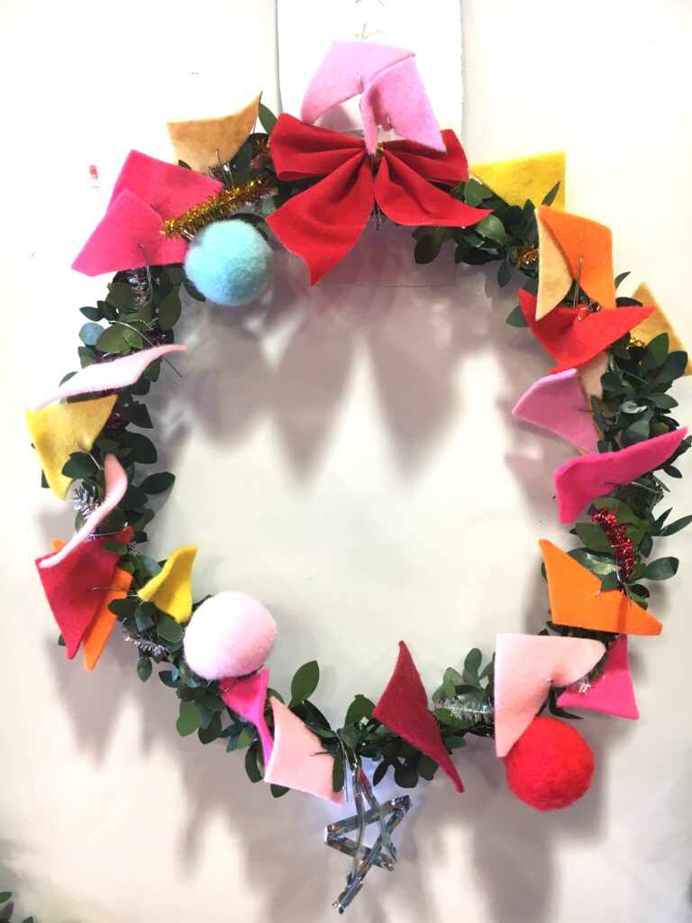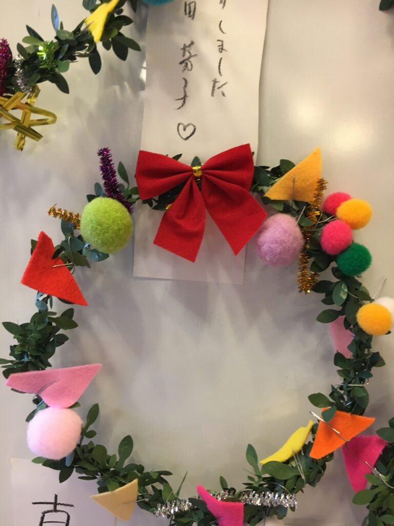 However, this proved a difficult challenge. How to make the base ring for the wreath? Wire was too stiff and lacked that wreath-like feel. Budget was also a factor. The 100-yen shop – an essential stop – was where I found artificial green vines, sparking my imagination. What if we decorated these with colourful felt and pom-poms?