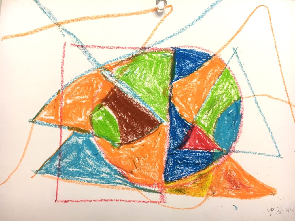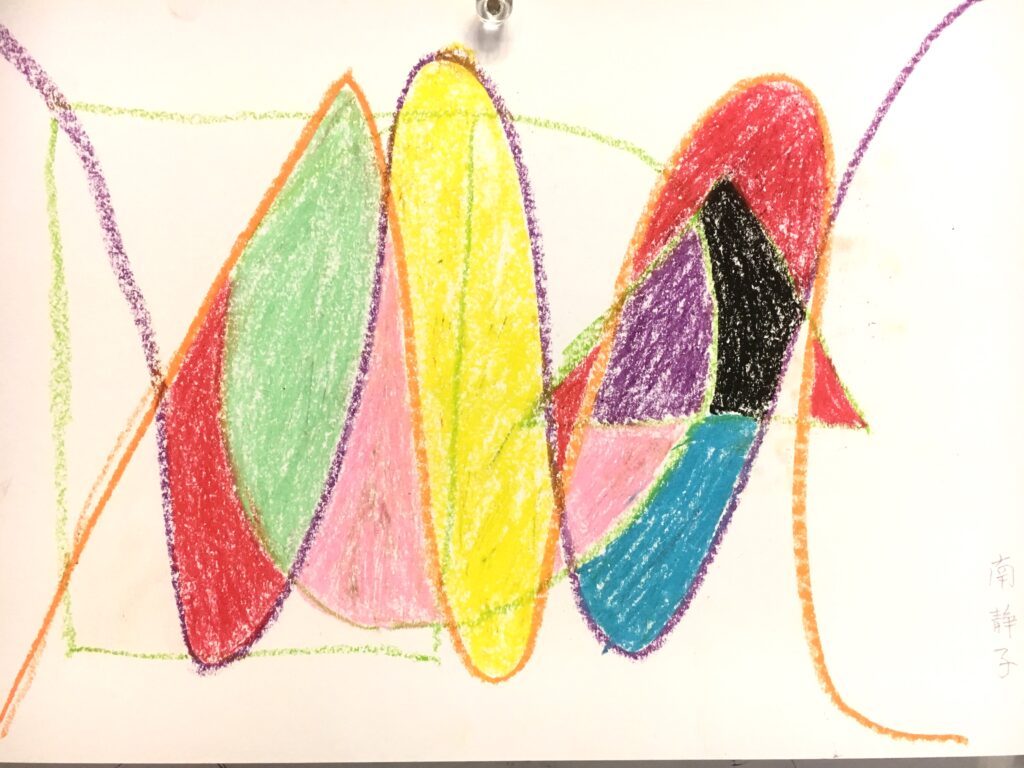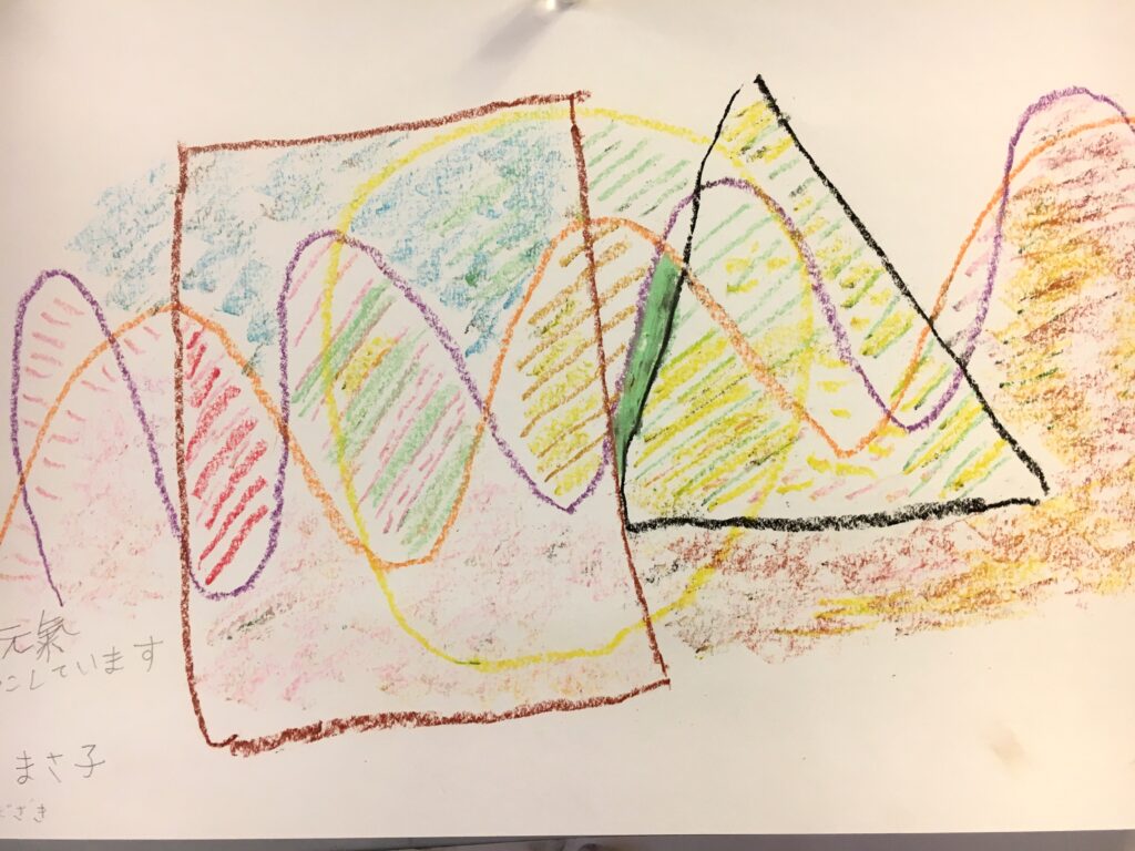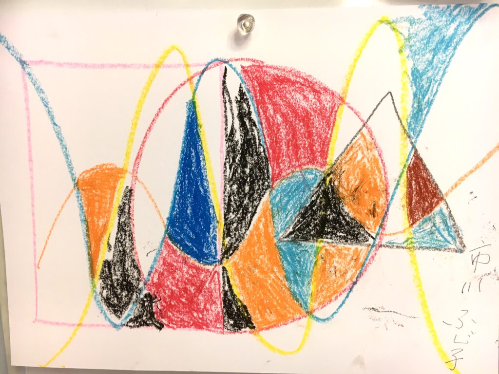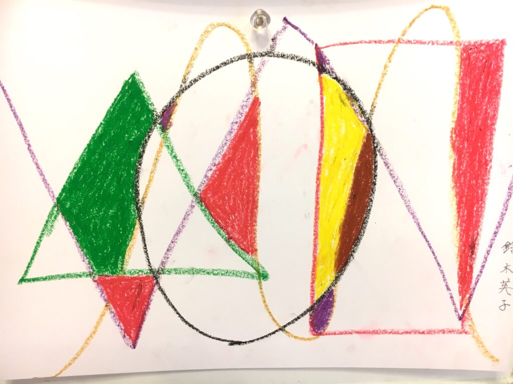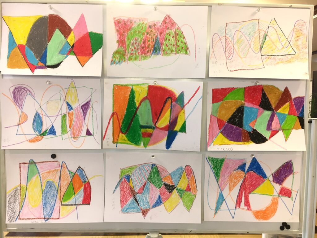 この変形色構図は、曲線が肝で、画用紙に目的もなく曲線を重ねて描いていただき、そこに直線もいれる。