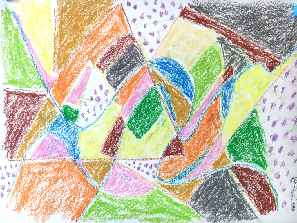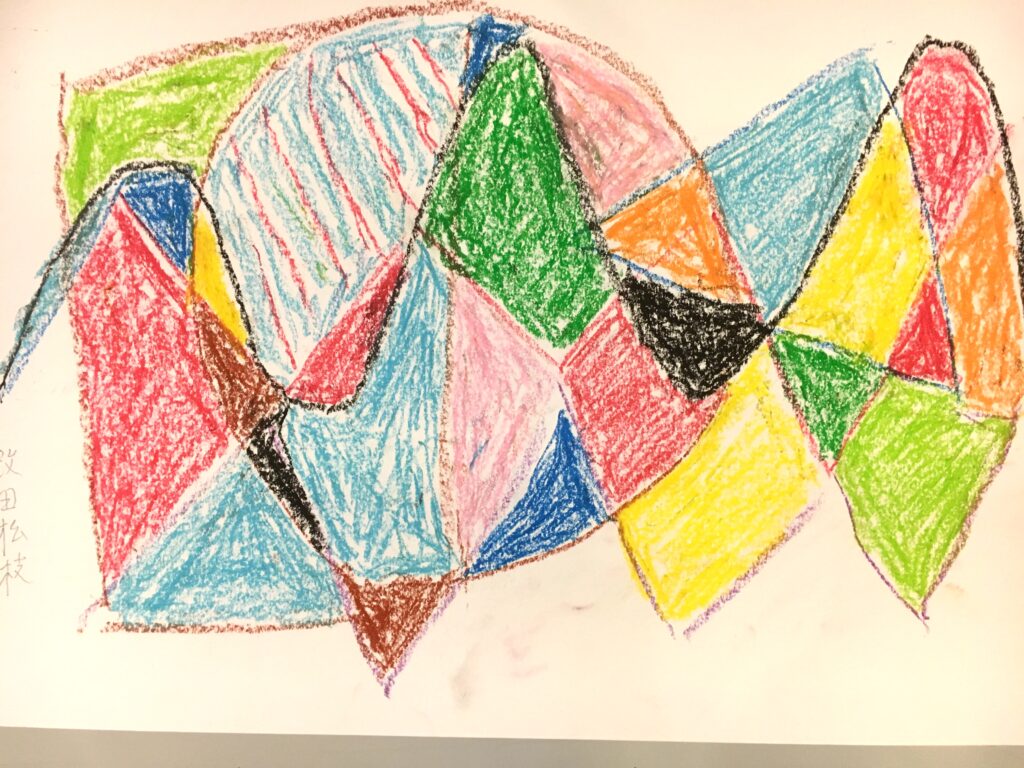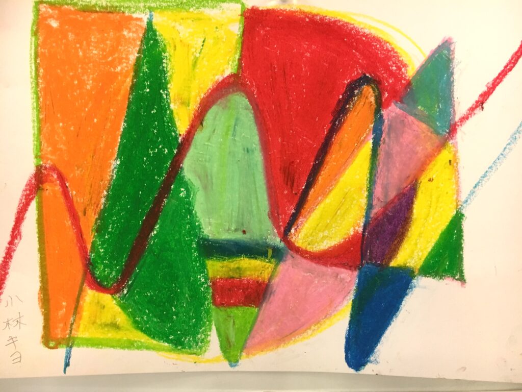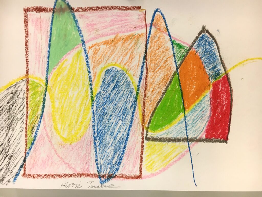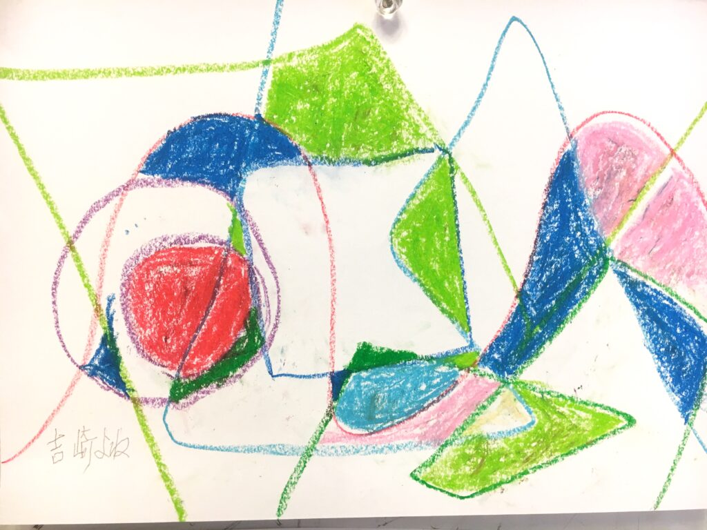 この変形色構図は、曲線が肝で、画用紙に目的もなく曲線を重ねて描いていただき、そこに直線もいれる。