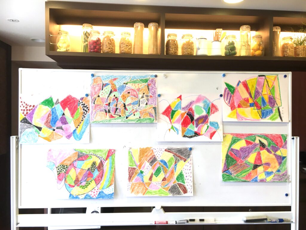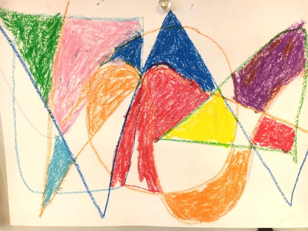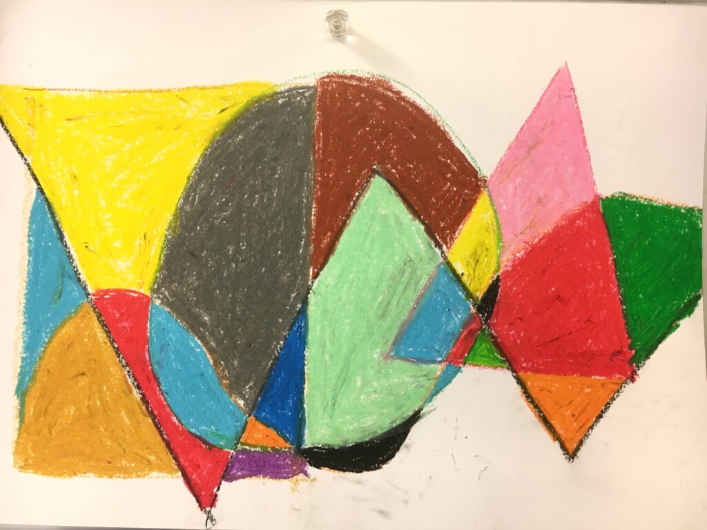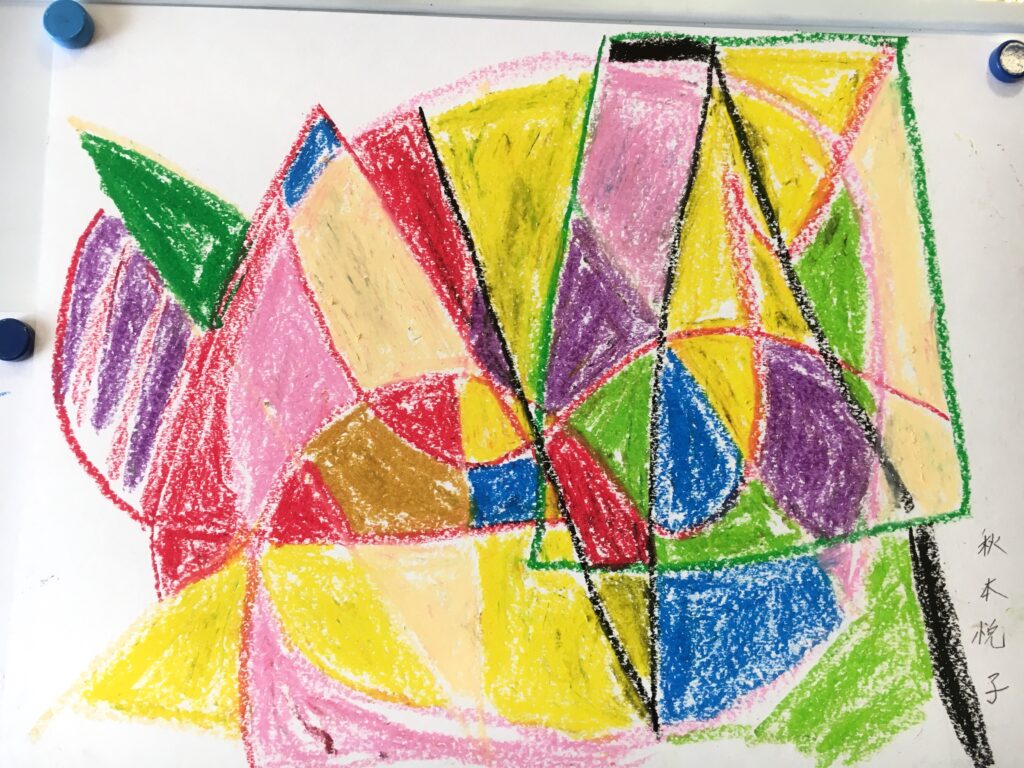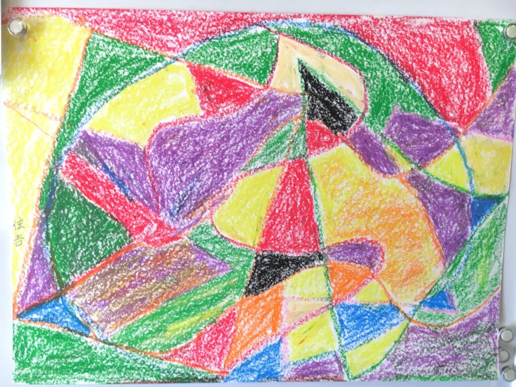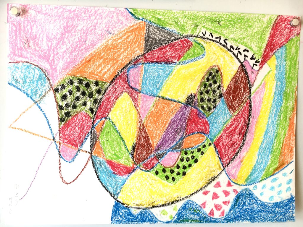 この変形色構図は、曲線が肝で、画用紙に目的もなく曲線を重ねて描いていただき、そこに直線もいれる。